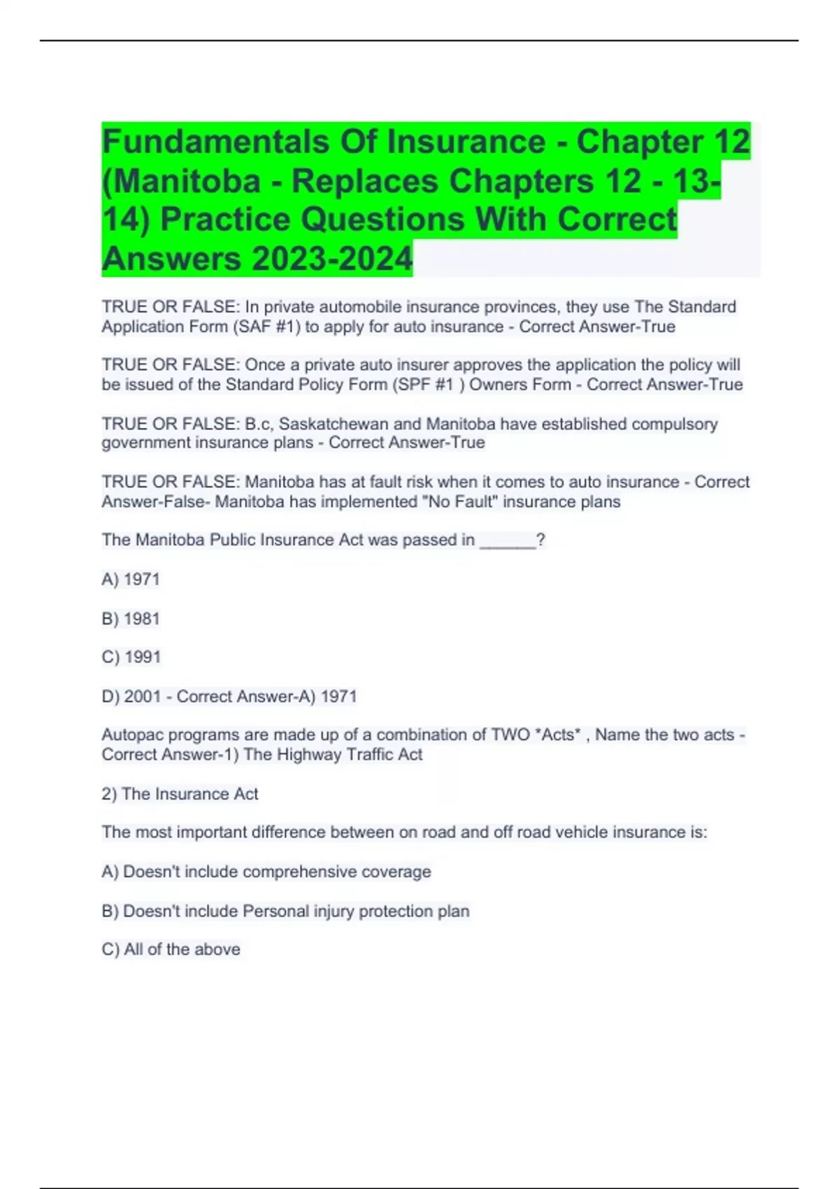 Fundamentals Of Insurance - Chapter 12 (Manitoba - Replaces Chapters 12 - 13- 14) Practice Questions With Correct Answers