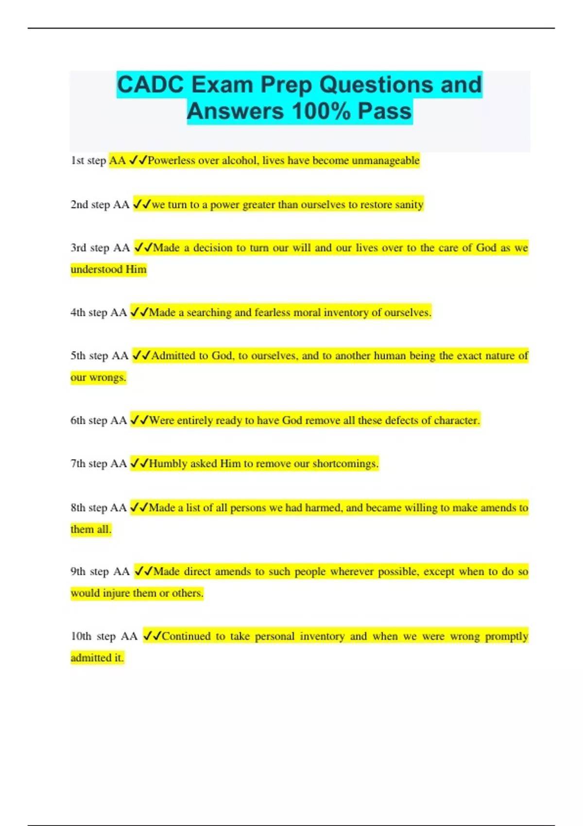 CADC Exam Prep Questions and Answers 100% Pass 1st step AA Powerless over alcohol, lives have become unmanageable 2nd step AA we turn to a power greater than ourselves to restore sanity 3rd step AA Made a decision to turn our will and our lives over to the care of God as we understood Him 4th step AA Made a searching and fearless moral inventory of ourselves. 5th step AA Admitted to God, to ourselves, and to another human being the exact nature of our wrongs. 6th step AA Were entirely ready to have God remove all these defects of character. 7th step AA Humbly asked Him to remove our shortcomings. 8th step AA Made a list of all persons we had harmed, and became willing to make amends to them all. 9th step AA Made direct amends to such people wherever possible, except when to do so would injure them or others. 10th step AA Continued to take personal inventory and when we were wrong promptly admitted it.