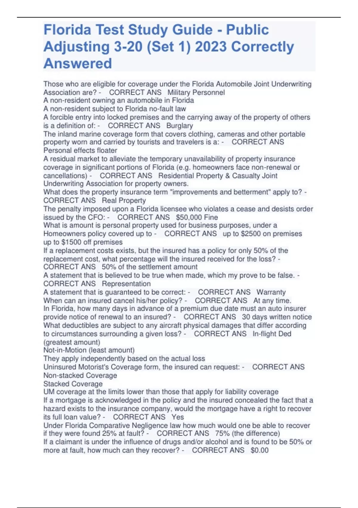 Florida Test Study Guide - Public Adjusting 3-20 (Set 1) 2023 Correctly Answered