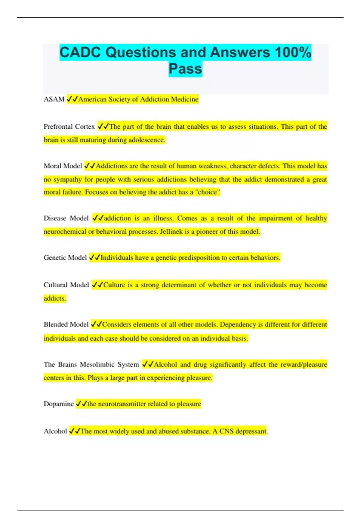 CADC Questions and Answers 100% Pass ASAM American Society of Addiction Medicine Prefrontal Cortex The part of the brain that enables us to assess situations. This part of the brain is still maturing during adolescence. Moral Model Addictions are the result of human weakness, character defects. This model has no sympathy for people with serious addictions believing that the addict demonstrated a great moral failure. Focuses on believing the addict has a "choice" Disease Model addiction is an illness. Comes as a result of the impairment of healthy neurochemical or behavioral processes. Jellinek is a pioneer of this model. Genetic Model Individuals have a genetic predisposition to certain behaviors. Cultural Model Culture is a strong determinant of whether or not individuals may become addicts. Blended Model Considers elements of all other models. Dependency is different for different individuals and each case should be considered on an individual basis. The Brains Mesolimbic System Alcohol and drug significantly affect the reward/pleasure centers in this. Plays a large part in experiencing pleasure. Dopamine the neurotransmitter related to pleasure Alcohol The most widely used and abused substance. A CNS depressan