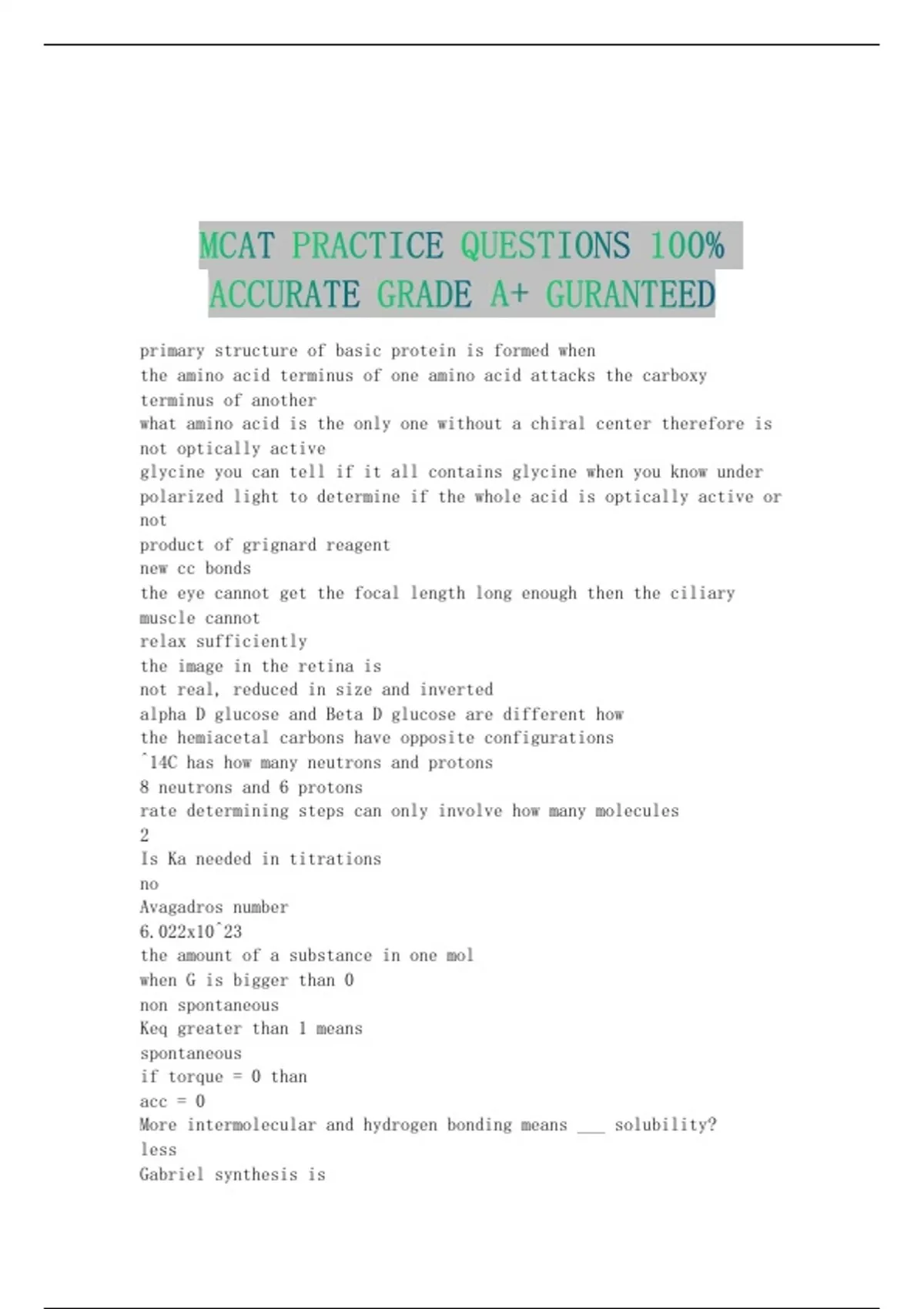 MCAT PRACTICE QUESTIONS 100% ACCURATE GRADE A+ GURANTEED