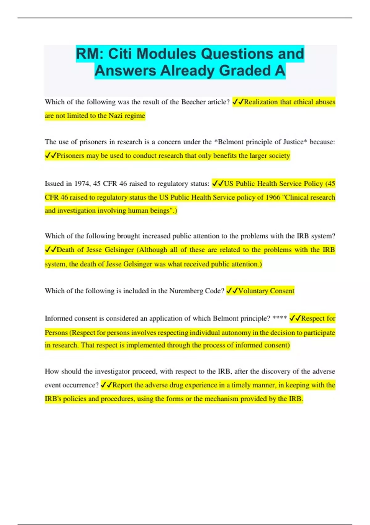 RM: Citi Modules Questions and Answers Already Graded A Which of the following was the result of the Beecher article? Realization that ethical abuses are not limited to the Nazi regime The use of prisoners in research is a concern under the *Belmont principle of Justice* because: Prisoners may be used to conduct research that only benefits the larger society Issued in 1974, 45 CFR 46 raised to regulatory status: US Public Health Service Policy (45 CFR 46 raised to regulatory status the US Public Health Service policy of 1966 "Clinical research and investigation involving human beings".) Which of the following brought increased public attention to the problems with the IRB system? Death of Jesse Gelsinger (Although all of these are related to the problems with the IRB system, the death of Jesse Gelsinger was what received public attention.) Which of the following is included in the Nuremberg Code? Voluntary Consent Informed consent is considered an application of which Belmont principle? **** Respect for Persons (Respect for persons involves respecting individual autonomy in the decision to participate in research. That respect is implemented through the process of informed consent) How should the investigator proceed, with respect to the IRB, after the discovery of the adverse event occurrence? Report the adverse drug experience in a timely manner, in keeping with the IRB's policies and procedures, using the forms or the mechanism provided by the IRB