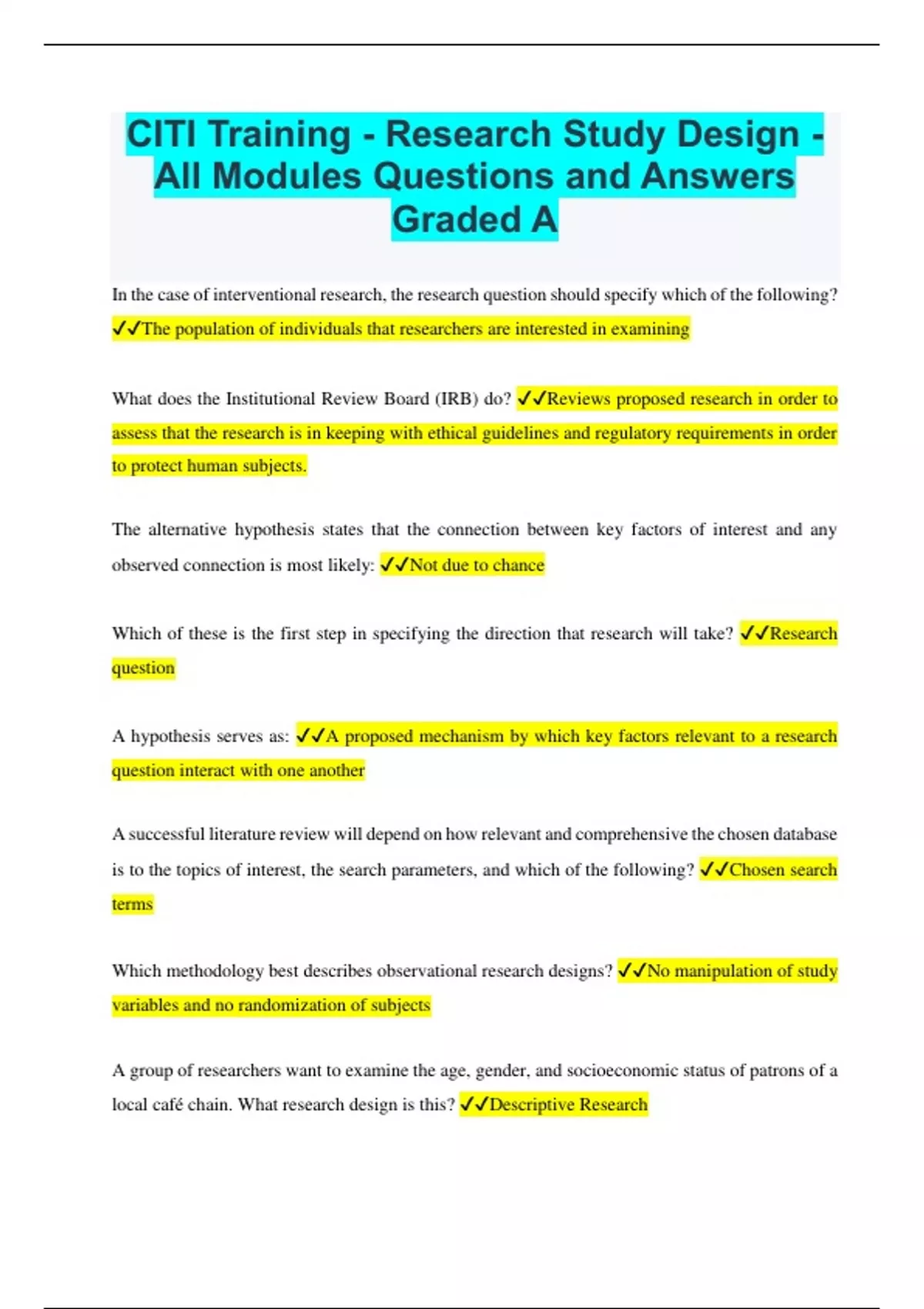 CITI Training - Research Study Design - All Modules Questions and Answers Graded A In the case of interventional research, the research question should specify which of the following? The population of individuals that researchers are interested in examining What does the Institutional Review Board (IRB) do? Reviews proposed research in order to assess that the research is in keeping with ethical guidelines and regulatory requirements in order to protect human subjects. The alternative hypothesis states that the connection between key factors of interest and any observed connection is most likely: Not due to chance Which of these is the first step in specifying the direction that research will take? Research question A hypothesis serves as: A proposed mechanism by which key factors relevant to a research question interact with one another A successful literature review will depend on how relevant and comprehensive the chosen database is to the topics of interest, the search parameters, and which of the following? Chosen search terms Which methodology best describes observational research designs? No manipulation of study variables and no randomization of subjects A group of researchers want to examine the age, gender, and socioeconomic status of patrons of a local café chain. What research design is this? Descriptive Research A group of researchers want to examine the effects of "Boston cream" donuts versus "glazed" donuts. They observe a group of people who only eat Boston cream donuts and another group that only eats glazed donuts. The groups are going to be followed for ten years and the occurrence of diabetes will be compared amongst the two groups. What type of study is this Prospective Cohort A group of researchers find that very few café customers are willing to talk to them. So, they now decide to look at public records available online at the Centers for Disease Control and Prevention (CDC). They intend to access diabetes prevalence data in each state. They are then going to examine the number of café franchises in each state. Finally, they will look for a relationship between the number of café franchises and diabetes prevalence. What type of study is this? Correlational The objectives of descriptive epidemiology are to address who, what, where, when, and how much of a variable under study is occurring. Which area would be most appropriate for a descriptive research design? Determine the prevalence of teenage pregnancies Researchers decide to find one customer who is willing to speak to them about their donut consumption. Apparently, this customer only started patronizing a certain café chain two months ago. Around the same time, she began experiencing migraine headaches. The researchers decide to do an in-depth analysis of this one case. What type of study is this? Case Study Researchers are testing the effects of a new weight loss method. Subjects will be randomly assigned to groups. One group will follow the new method and the other group will not. All subjects will be randomized a second time to watch a nutritional information video and the other group will receive a motivational speech. This will result in four different groups as follows: Weight Loss Method + Motivational Speech Weight Loss Method + Informational Video No Weight Loss Method + Motivational Speech No Weight Loss Method + Informational Video