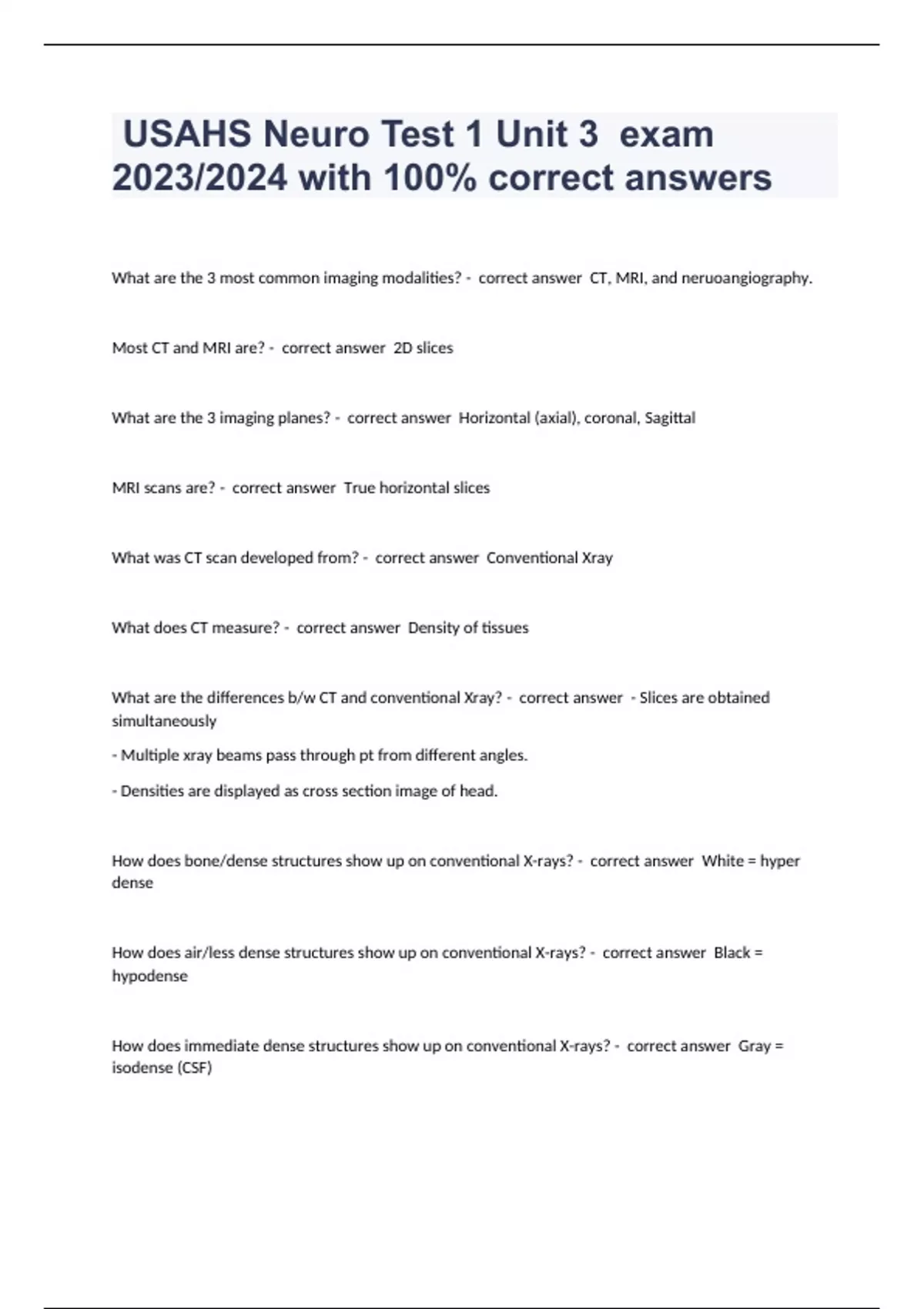 What are the 3 most common imaging modalities? - correct answer CT, MRI, and neruoangiography. Most CT and MRI are? - correct answer 2D slices What are the 3 imaging planes? - correct answer Horizontal (axial), coronal, Sagittal MRI scans are? - correct answer True horizontal slices What was CT scan developed from? - correct answer Conventional Xray What does CT measure? - correct answer Density of tissues What are the differences b/w CT and conventional Xray? - correct answer - Slices are obtained simultaneously - Multiple xray beams pass through pt from different angles. - Densities are displayed as cross section image of head. How does bone/dense structures show up on conventional X-rays? - correct answer White = hyper dense How does air/less dense structures show up on conventional X-rays? - correct answer Black = hypodense How does immediate dense structures show up on conventional X-rays? - correct answer Gray = isodense (CSF) Density is expressed in what? - correct answer Hounsfield Units HU = 0? - correct answer Water HU = -1000? - correct answer Air An acute abnormal finding with a CT would be? - correct answer Hyperdense b/c of blood coagulation. An acute abnormal finding one week post with a CT would be? - correct answer Isodense An acute abnormal finding 2-3 weeks post with a CT would be? - correct answer Hypodense Epidural hematoma - correct answer B/w dura mater and skull (lens/football shape) Acute Subdural H