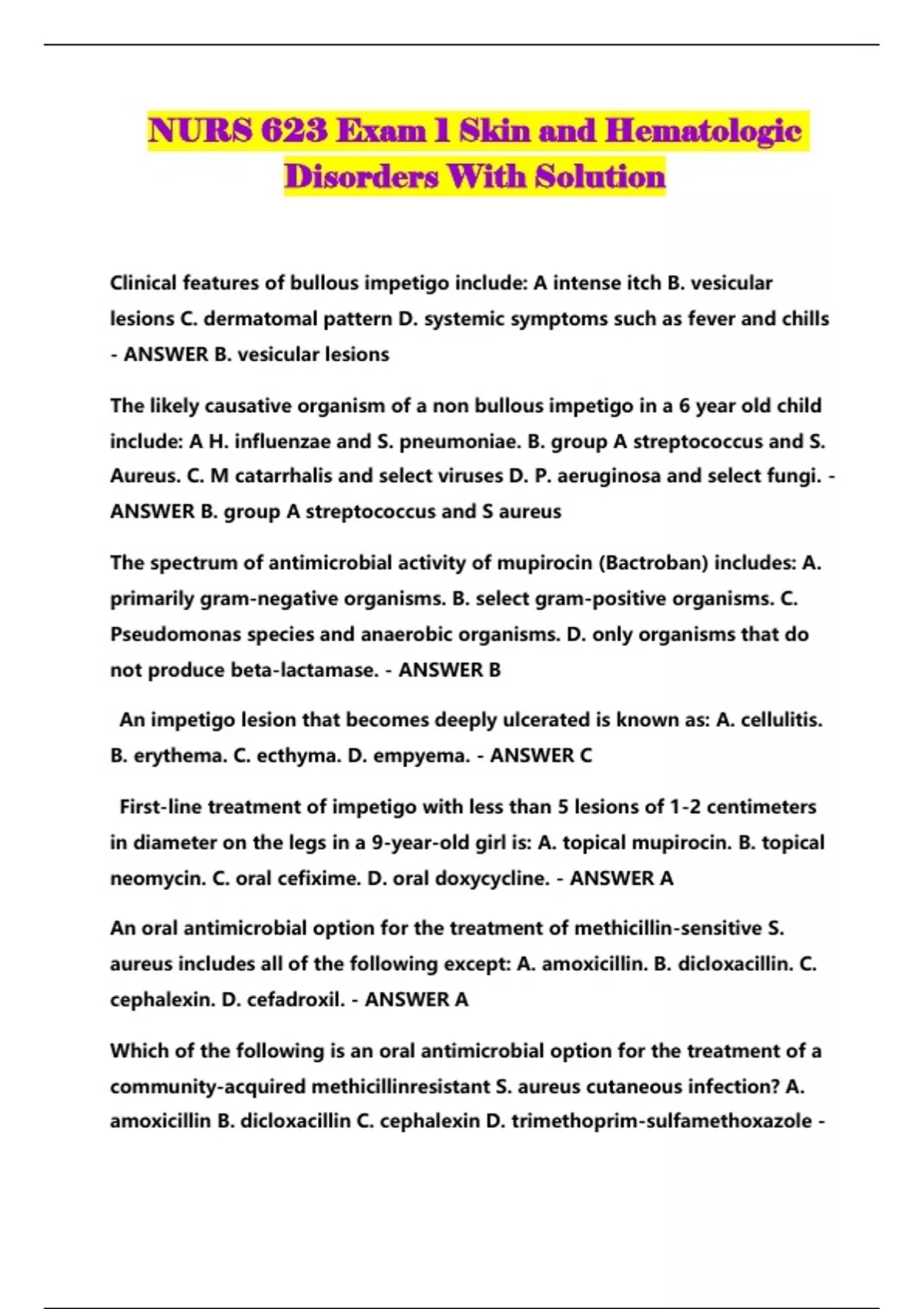 NURS 623 Exam 1 Skin and Hematologic Disorders With Solution...