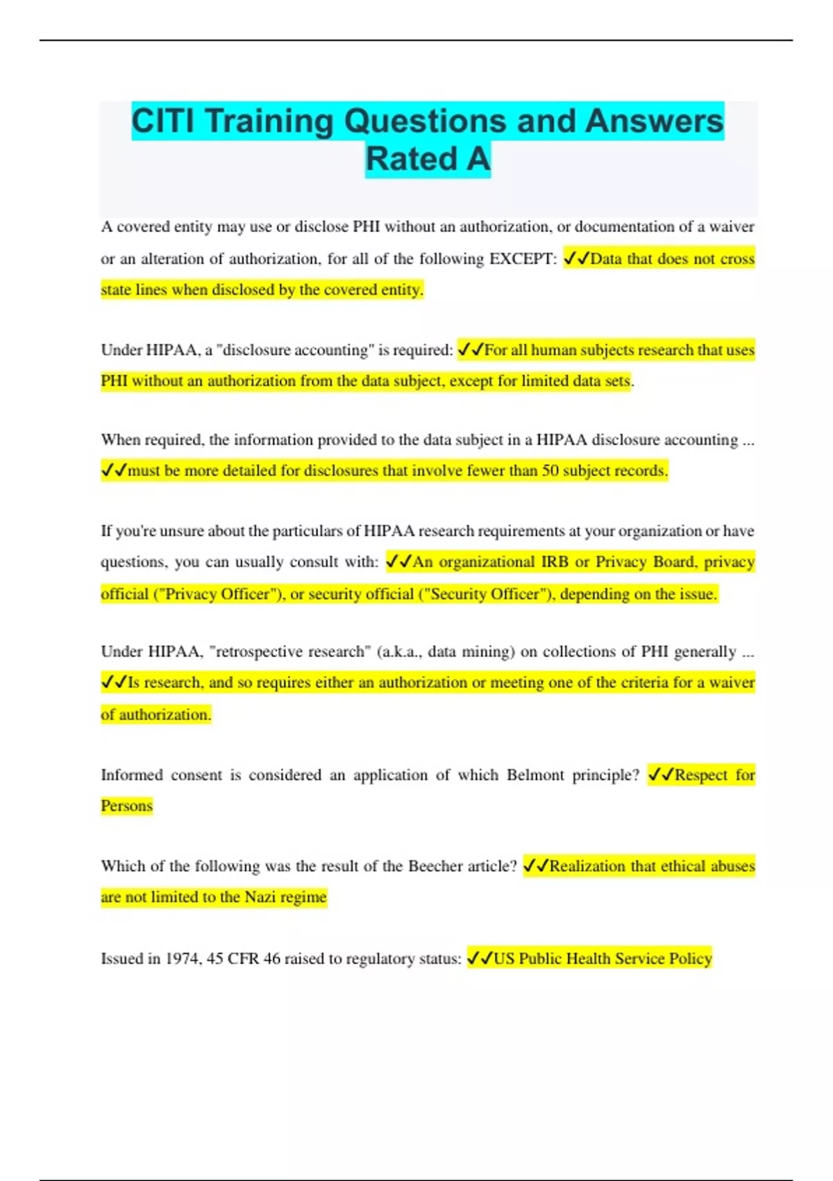 CITI Training Questions and Answers Rated A A covered entity may use or disclose PHI without an authorization, or documentation of a waiver or an alteration of authorization, for all of the following EXCEPT: Data that does not cross state lines when disclosed by the covered entity. Under HIPAA, a "disclosure accounting" is required: For all human subjects research that uses PHI without an authorization from the data subject, except for limited data sets. When required, the information provided to the data subject in a HIPAA disclosure accounting ... must be more detailed for disclosures that involve fewer than 50 subject records. If you're unsure about the particulars of HIPAA research requirements at your organization or have questions, you can usually consult with: An organizational IRB or Privacy Board, privacy official ("Privacy Officer"), or security official ("Security Officer"), depending on the issue.