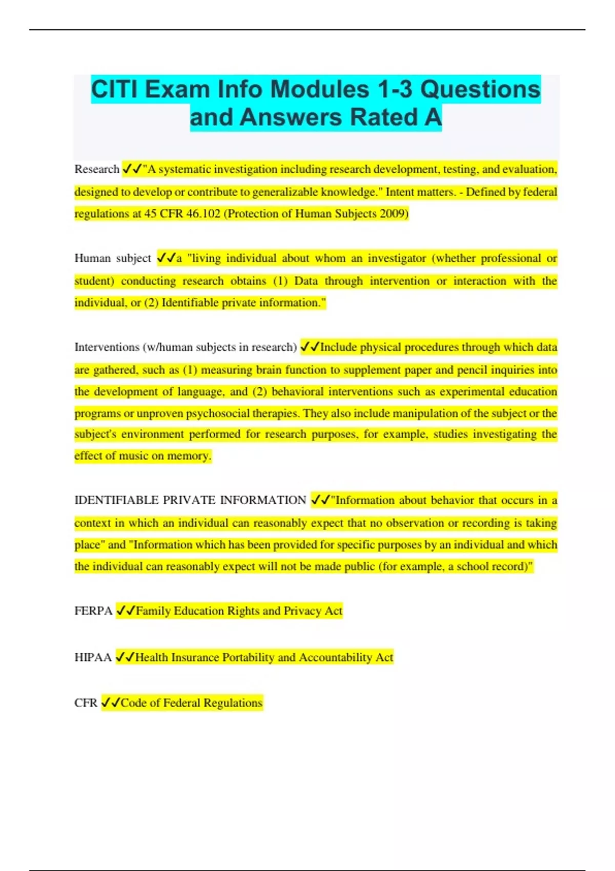 CITI Exam Info Modules 1-3 Questions and Answers Rated A Research "A systematic investigation including research development, testing, and evaluation, designed to develop or contribute to generalizable knowledge." Intent matters. - Defined by federal regulations at 45 CFR 46.102 (Protection of Human Subjects 2009) Human subject a "living individual about whom an investigator (whether professional or student) conducting research obtains (1) Data through intervention or interaction with the individual, or (2) Identifiable private information." Interventions (w/human subjects in research) Include physical procedures through which data are gathered, such as (1) measuring brain function to supplement paper and pencil inquiries into the development of language, and (2) behavioral interventions such as experimental education programs or unproven psychosocial therapies. They also include manipulation of the subject or the subject's environment performed for research purposes, for example, studies investigating the effect of music on memory. IDENTIFIABLE PRIVATE INFORMATION "Information about behavior that occurs in a context in which an individual can reasonably expect that no observation or recording is taking place" and "Information which has been provided for specific purposes by an individual and which the individual can reasonably expect will not be made public (for example, a school record)"