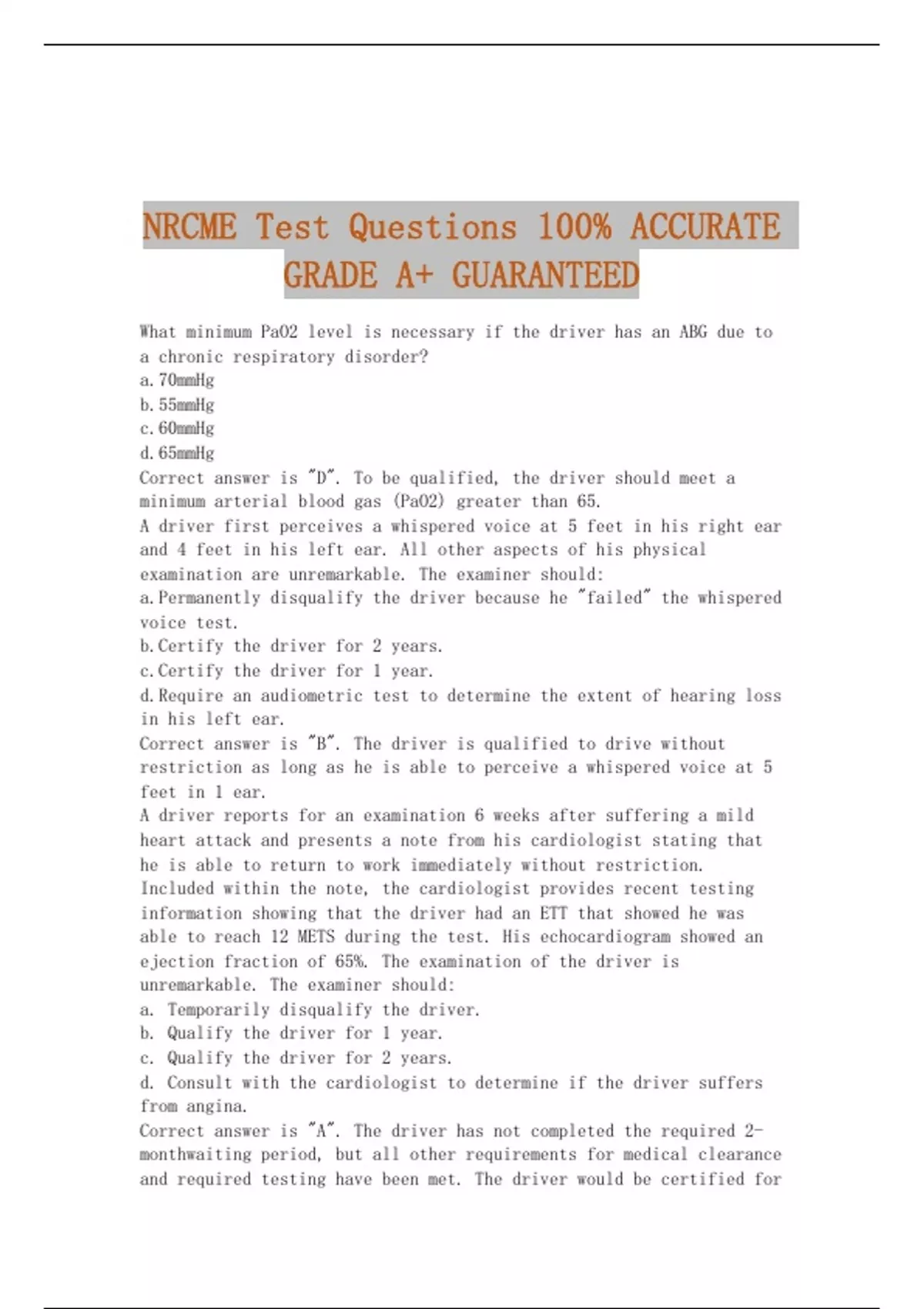 What minimum PaO2 level is necessary if the driver has an ABG due to a chronic respiratory disorder? a.70mmHg b.55mmHg c.60mmHg d.65mmHg Correct answer is "D". To be qualified, the driver should meet a minimum arterial blood gas (PaO2) greater than 65. A driver first perceives a whispered voice at 5 feet in his right ear and 4 feet in his left ear. All other aspects of his physical examination are unremarkable. The examiner should: a.Permanently disqualify the driver because he "failed" the whispered voice test. b.Certify the driver for 2 years. c.Certify the driver for 1 year. d.Require an audiometric test to determine the extent of hearing loss in his left ear. Correct answer is "B". The driver is qualified to drive without restriction as long as he is able to perceive a whispered voice at 5 feet in 1 ear. A driver reports for an examination 6 weeks after suffering a mild heart attack and presents a note from his cardiologist stating that he is able to return to work immediately without restriction. Included within the note, the cardiologist provides recent testing information showing that the driver had an ETT that showed he was able to reach 12 METS during the test. His echocardiogram showed an ejection fraction of 65%. The examination of the driver is unremarkable. The examiner should: a. Temporarily disqualify the driver. b. Qualify the driver for 1 year. c. Qualify the driver for 2 years. d. Consult with the cardiologist to determine if the driver suffers from angina. Correct answer is "A". The driver has not completed the required 2-monthwaiting period, but all other requirements for medical clearance and required testing have been met. The driver would be certified for 1 year at the completion of the waiting period. The date of the certification would be from the date of the original examination. A driver provides an audiometric test documenting the following: 1. 500 Hz: 2. 1000 HZ: 3. 2000 HZ: 4. 4000 Hz: 35 Right ear; 40 Left ear 40 Right ear; 45 Left ear 40 Right ear; 45 Left ear 50 Right ear; 50 Left ear 5. The medical examiner should: a. Disqualify the driver because he does not meet minimum hearing requirementsto drive. b. Certify the driver for 2years. c. Certify the driver for 1 year. d. Require the driver to obtain a hearing exemption. Correct answer is "B". The examiner would average the results from 500 Hz, 1000 Hz and 2000 Hz. This average is 38.33 in the Right and 43.33 in the Left ear. A driver must have an average hearing loss of less than or equal to 40 in the better ear. This does not have to be met in both ears. During the examination of a commercial driver, the examiner notices that the driver's peripheral vision is 70 degrees to the left and 80 degrees to the right. The examiner should: a. Qualify the driver for 2 years. b. Require the driver to obtain a vision exemption because of the limitation in the driver's left peripheral field. c. Disqualify the driver. d. Have the driver consult with an Ophthalmologist to determine if the driver's peripheral vision meets minimum standards. Correct answer is "A". A driver must exhibit a minimum peripheral vision of 70 degrees bilaterally. During examination, the medical examiner notices that the driver is distant, lacks eye contact and shows absolutely no emotional response during the exam. The examiner's best response should be: a. Provide the driver with a "CAGE" questionnaire to determine if he suffers from alcoholism. b. c. Certify the driver with a 1-time, 3-month certificate to determine if there is any effect on the driver's ability to drive a CMV. d. Require a skill performance evaluation to ascertain if the driver has any limitations with driving. Correct answer is "B". The driver exhibits what may be considered a "flat affect" which is seen in schizophrenia and in severe depression. The driver should be evaluated by a mental health expert to make a diagnosis prior to certification. A driver admits to the use of marijuana for the treatment of his glaucoma, which is legal in the State in which he lives. He provides medical documentation for the glaucoma indicating he is able to drive a truck. He began using the marijuana about three months ago. His current medical card has no limitations listed and is for 2 years. His certification examination is within normal limits. The medical examiner should: a. Disqualify the driver. b. Perform a urine drug collection and provide the release from the testing provider. c. Certify the driver for 1 year. d. Certify the driver for 2 years. Correct answer is "A". Use of marijuana is prohibited by Federal law while driving a CMV and trumps State law in this matter. A driver has a blood pressure of 136/92 mm Hg. This is: a. Within normal limits and would not affect the driver's certification. b. Stage 1 Hypertension. c. Stage 2 Hypertension. d. Stage 3 Hypertension. Correct answer is "B". This is Stage 1 Hypertension, which is defined as 140-159/90 - 99. A driver is taking Celexa for the treatment of what he calls a "mild depression." He reports he has not considered or attempted suicide. The examiner should? a.Temporarily disqualify the driver until he obtains written clearance for the depression and the medication from the treating provi b. Certify the driver for a period of 1 year. c. Certify the driver for a period of 2 years. d. Disqualify the driver until he is no longer requiring medication for the treatment of depression. Correct answer is "A". Medical clearance is required for all mental health disorders. Celexa is an SSRI or 2nd Generation anti-depressant and is acceptable. A driver reports that he had a hunting accident wherein he suffered a left orbital fracture. He presents a note at the time of the examination from an ophthalmologist stating "may drive". His exam is unremarkable except for a limitation in peripheral vision in his left eye, which was inconclusive. His distance vision was 20/20 right and 20/40 left. The medical examiner should? a. Council the driver o