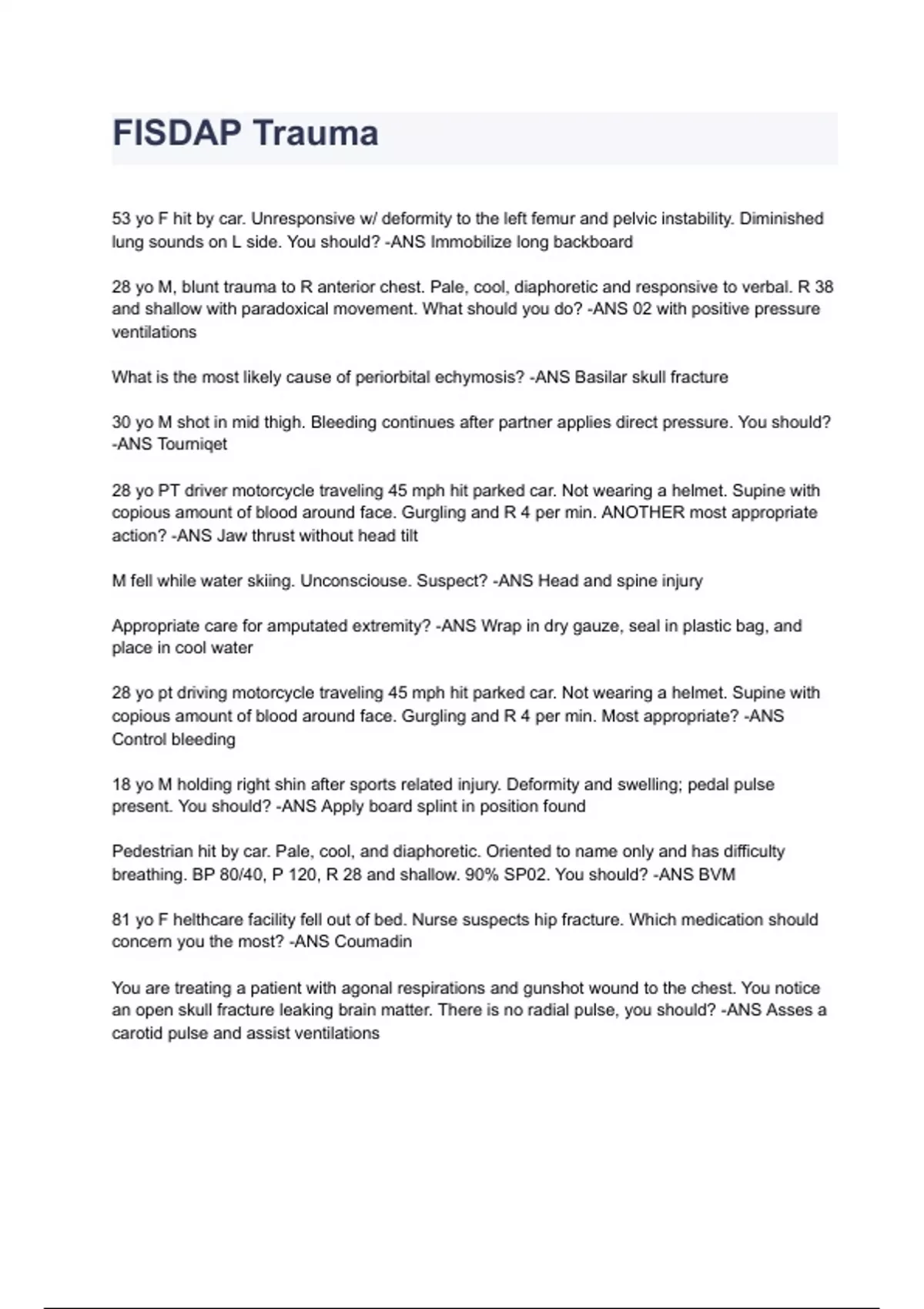 Pedestrian hit by car. Pale, cool, and diaphoretic. Oriented to name only and has difficulty