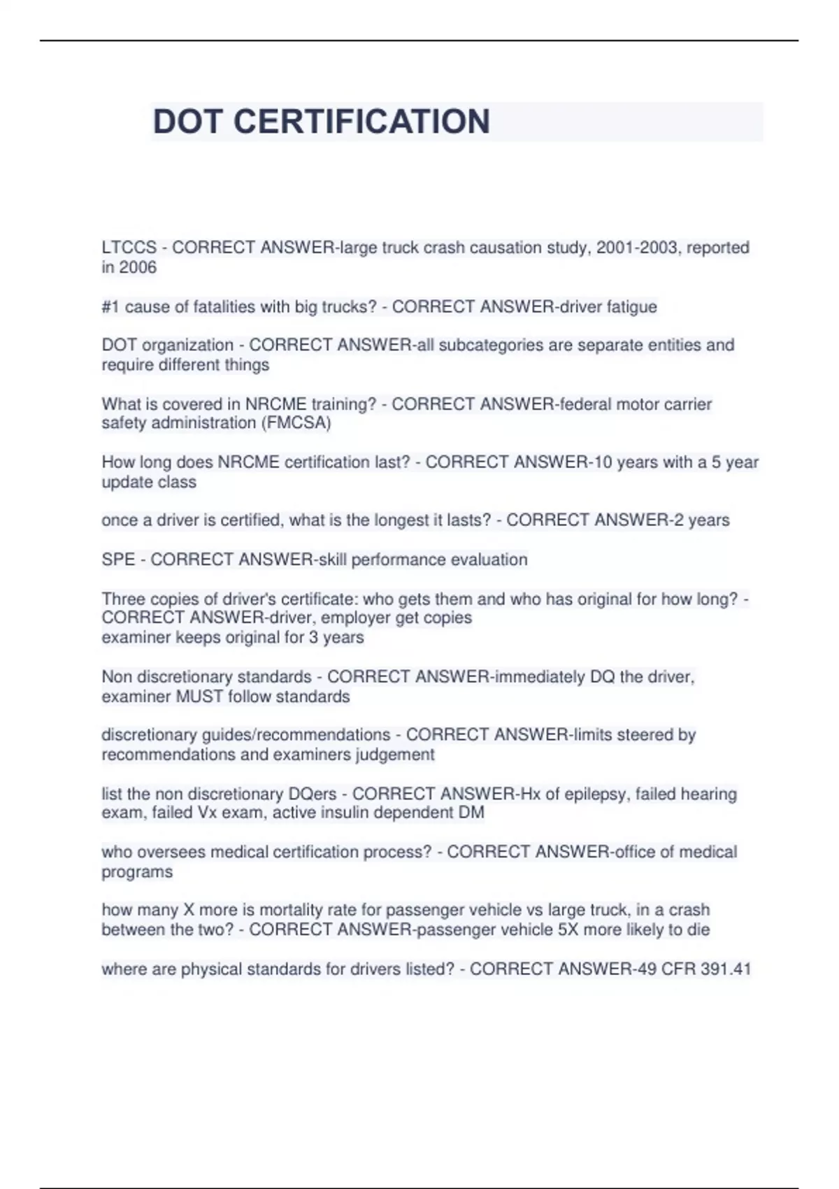 DOT CERTIFICATION LTCCS - CORRECT ANSWER-large truck crash causation study, , reported in 2006 #1 cause of fatalities with big trucks? - CORRECT ANSWER-driver fatigue DOT organization - CORRECT ANSWER-all subcategories are separate entities and require different things What is covered in NRCME training? - CORRECT ANSWER-federal motor carrier safety administration (FMCSA) How long does NRCME certification last? - CORRECT ANSWER-10 years with a 5 year update class once a driver is certified, what is the longest it lasts? - CORRECT ANSWER-2 years SPE - CORRECT ANSWER-skill performance evaluation Three copies of driver's certificate: who gets them and who has original for how long? - CORRECT ANSWER-driver, employer get copies examiner keeps original for 3 years Non discretionary standards - CORRECT ANSWER-immediately DQ the driver, examiner MUST follow standards discretionary guides/recommendations - CORRECT ANSWER-limits steered by recommendations and examiners judgement list the non discretionary DQers - CORRECT ANSWER-Hx of epilepsy, failed hearing exam, failed Vx exam, active insulin dependent DM who oversees medical certification process? - CORRECT ANSWER-office of medical programs how many X more is mortality rate for passenger vehicle vs large truck, in a crash between the two? - CORRECT ANSWER-passenger vehicle 5X more likely to die where are physical standards for drivers listed? - CORRECT ANSWER-49 CFR 391.41 define CMV - CORRECT ANSWER-commercial motor vehicle: any self propelled or towed MV used on a highway in interstate commerce to transport passengers or property...10k lbs or more, 8+ passengers for $$, 15+ passengers not for $$, hazardous materials where is CMV defined? - CORRECT ANSWER-40 CFR 390.5 where are medical examiner qualifications found? - CORRECT ANSWER-49 CFR 391.43 Where are general qualifications for CMV drivers found? - CORRECT ANSWER-49 CFR 391.11 list non-discretionary standards - CORRECT ANSWER-loss of limb, limb impairment, CV condition, respiratory dysfunction, HTN, RA/OA/orthopedic/muscular, mental disorder, drug use, alcoholism "average" driver demographics - CORRECT ANSWER-male, 40+, sedentary, obese, smoker, poor eating habits "average" driver medical health - CORRECT ANSWER-less healthy than average citizen, 2+ medical conditions, CV disease list 9 occupational stressors for CMV drivers - CORRECT ANSWER-type of route, schedule, finances, vehicle, road conditions, environmental, type of cargo when can a driver on insulin be certified? - CORRECT ANSWER-if he/she has FMCSA waiver - 49 CFR 391.64 OR federal exemption program FMCSA definition of "severe hypoglycemia" - CORRECT ANSWER-seizure, LOC, need assistance from others, impaired cog fxn if severe hypoglycemia, ask if driver has had reactions how frequently? - CORRECT ANSWER-1+ in last 12 months 2+ in last 5 years what happens if driver has loss of proprioception? what about peripheral neuropathy? - CORRECT ANSWER-DQ and DQ what if DM patient has resting tachycardia or orthostatic HOTN? - CORRECT ANSWER-DQ what if driver has silver wire, cotton patches? - CORRECT ANSWER-qualify but recommend ophthalmologist yearly what if driver has unstable retinopathy where neovascularization extends into vitreous? - CORRECT ANSWER-DQ driver uses telescopic lenses? - CORRECT ANSWER-DQ what if driver on incretin mimetics? what about other oral hypoglycemics? - CORRECT ANSWER-certify for one year DM exemption requires a driver to: - CORRECT ANSWER-annual endocrinology visit, annual optho visit, DM education, glucose monitoring forced whisper test - CORRECT ANSWER-hear a forced whisper at no less than 5ft audiometric testing limits - CORRECT ANSWER-average hearing loss no greater than 40 decibels can driver wear hearing aids during forced whisper test? - CORRECT ANSWER-yes audiometer should be calibrated to what standard? - CORRECT ANSWER-American National Standards Institute (ANSI) Z24.5-1951 driver wears a hearing aid. can you do in office whisper test? what about audiometry test? - CORRECT ANSWER-yes for whisper, no for audiometry how to calculate hearing loss? - CORRECT ANSWER-determine what decibels heard at 500Hz, 1000Hz, 2000Hz in one ear. Add the results and divide by three. Result = average hearing loss. Audiometric testing - results? - CORRECT ANSWER-qualify driver if less than 40dB hearing loss in good ear. both ears more than 40=DQ how to convert from International Organization for Standardization to ANSI? - CORRECT ANSWER-minus 14 from 500 minus 10 from 1000 minus 8.5 from 2000 which test to do first, whisper or audiometric? - CORRECT ANSWER-doesn't matter as long as one is passed, driver is qualified which otic diseases disqualify driver? - CORRECT ANSWER-BPPV w/ Sx in last 2 months menieres labyrinthine fistula nonfunctioning labyrinths Required vision tests? - CORRECT ANSWER-visual acuity (snellen/titmus), peripheral horizontal visual fields, color vision Snellen visual acuity - ft away from chart and standards? - CORRECT ANSWER-20 ft from chart, both eyes together and each eye must be 20/40 peripheral field of vision test? - CORRECT ANSWER-70 degrees what colors does driver need to distinguish between? - CORRECT ANSWER-green amber red driver has retinopathy - what to do? - CORRECT ANSWER-you can certify but driver must have annual medical exam, annual optho exam driver has unstable proliferative retinopathy - CORRECT ANSWER-DQ driver can only meet requirements for Vx in one eye - CORRECT ANSWER-DQ driver has contacts - one corrects for distance, one corrects for near acuity - CORRECT ANSWER-DQ Federal vision exempt program - CORRECT ANSWER-2 years monocular vision study - CORRECT ANSWER-49 CFR 391.64, grandfathered in, driver can be certified for 1 year you note HTN for first time in driver. what to do? - CORRECT ANSWER-certify for one year, after one year, certify for 3 months driver had stage 1 HTN, certified for 1 yr + 3 months, now what? - CORRECT ANSWER-DQ BP = 180/110 - CORRECT ANSWER-DQ, if driv