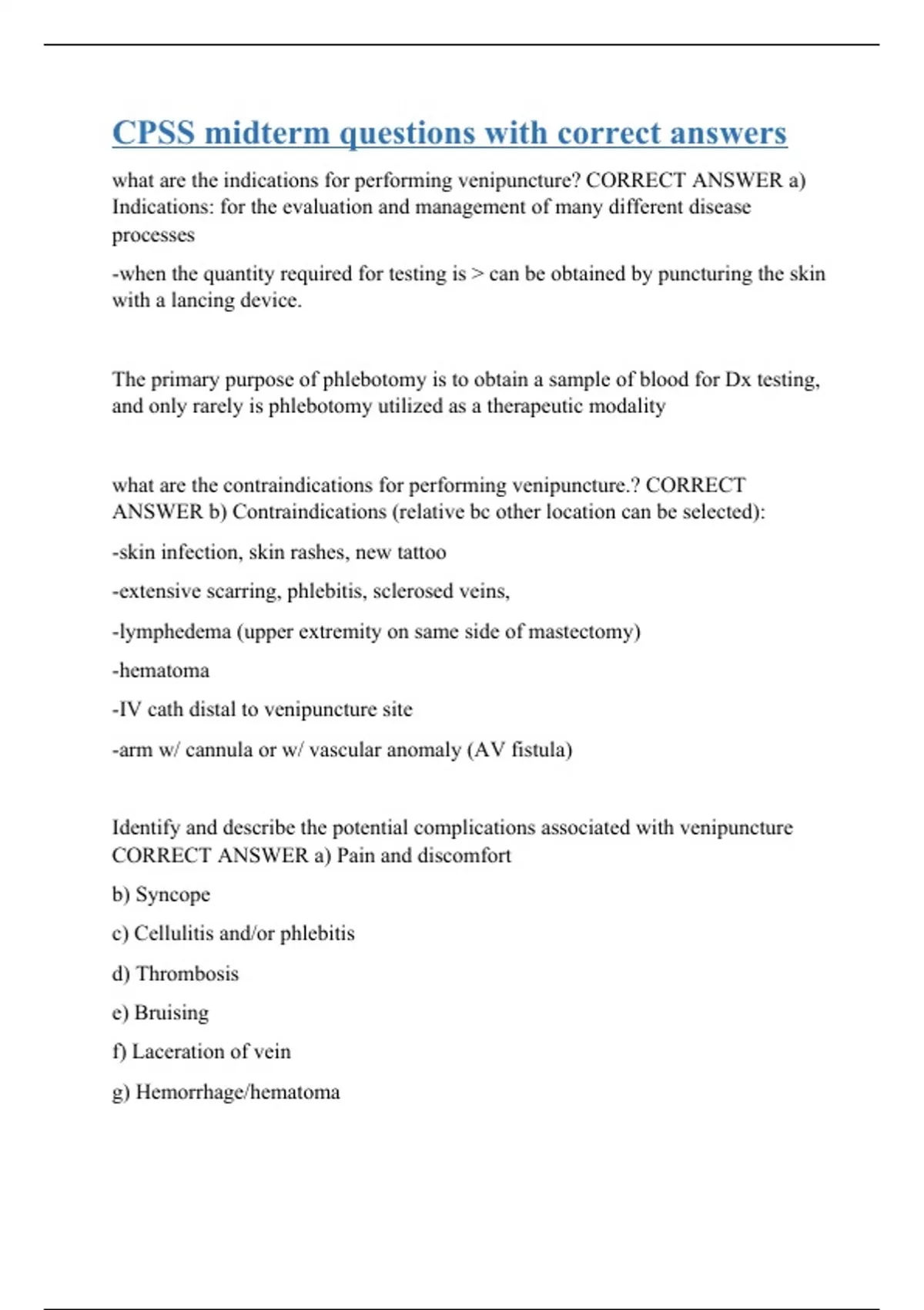 what are the indications for performing venipuncture? CORRECT ANSWER a) Indications: for the evaluation and management of many different disease processes -when the quantity required for testing is > can be obtained by puncturing the skin with a lancing device. The primary purpose of phlebotomy is to obtain a sample of blood for Dx testing, and only rarely is phlebotomy utilized as a therapeutic modality what are the contraindications for performing venipuncture.? CORRECT ANSWER b) Contraindications (relative bc other location can be selected): -skin infection, skin rashes, new tattoo -extensive scarring, phlebitis, sclerosed veins, -lymphedema (upper extremity on same side of mastectomy) -hematoma -IV cath distal to venipuncture site -arm w/ cannula or w/ vascular anomaly (AV fistula) Identify and describe the potential complications associated with venipuncture CORRECT ANSWER a) Pain and discomfort b) Syncope c) Cellulitis and/or phlebitis d) Thrombosis e) Bruising f) Laceration of vein g) Hemorrhage/hematoma