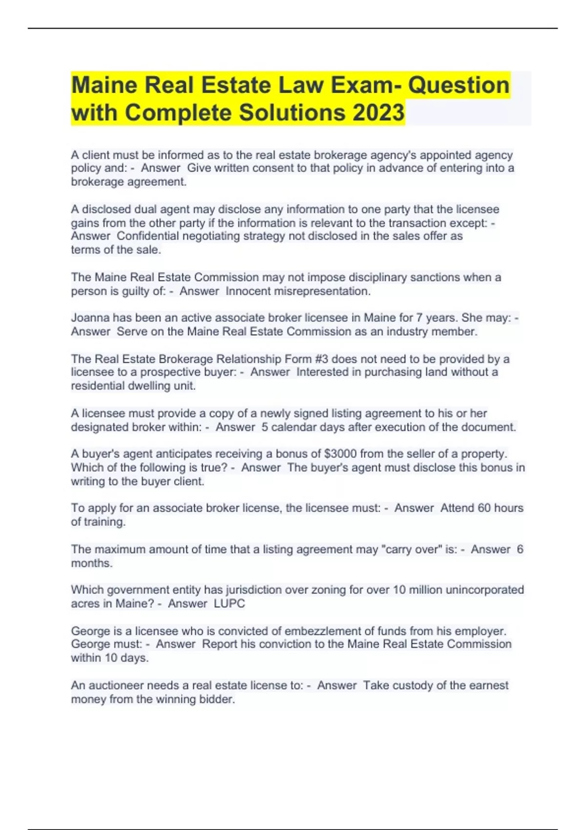 Maine Real Estate Law Exam- Question with Complete Solutions 2023