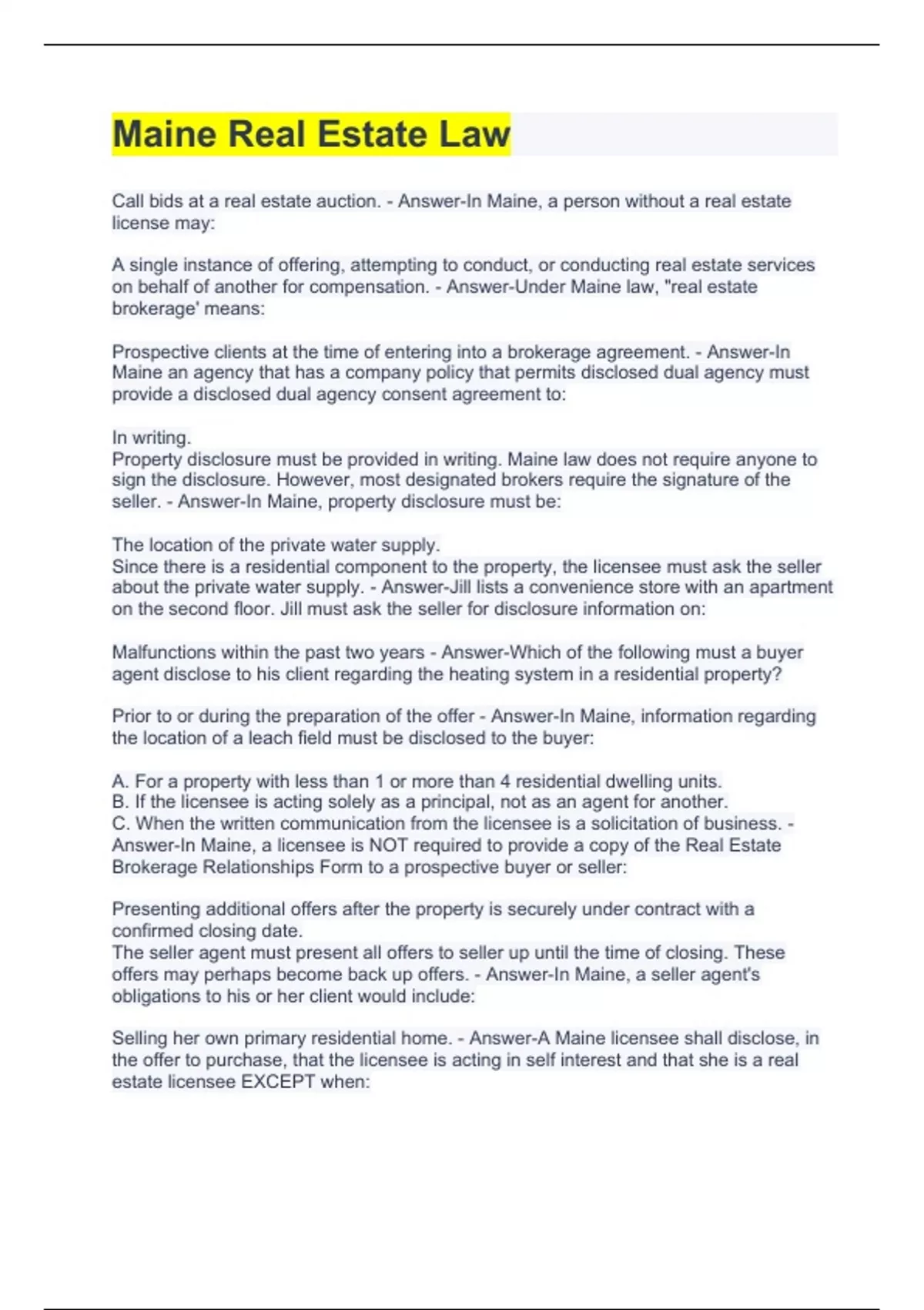 Call bids at a real estate auction. - Answer-In Maine, a person without a real estate license may: A single instance of offering, attempting to conduct, or conducting real estate services on behalf of another for compensation. - Answer-Under Maine law, "real estate brokerage' means: Prospective clients at the time of entering into a brokerage agreement. - Answer-In Maine an agency that has a company policy that permits disclosed dual agency must provide a disclosed dual agency consent agreement to: In writing. Property disclosure must be provided in writing. Maine law does not require anyone to sign the disclosure. However, most designated brokers require the signature of the seller. - Answer-In Maine, property disclosure must be: The location of the private water supply. Since there is a residential component to the property, the licensee must ask the seller about the private water supply. - Answer-Jill lists a convenience store with an apartment on the second floor. Jill must ask the seller for disclosure information on: Malfunctions within the past two years - Answer-Which of the following must a buyer agent disclose to his client regarding the heating system in a residential property? Prior to or during the preparation of the offer - Answer-In Maine, information regarding the location of a leach field must be disclosed to the buyer: A. For a property with less than 1 or more than 4 residential dwelling units. B. If the licensee is acting solely as a principal, not as an agent for another. C. When the written communication from the licensee is a solicitation of business. - Answer-In Maine, a licensee is NOT required to provide a copy of the Real Estate Brokerage Relationships Form to a prospective buyer or seller: Presenting additional offers after the property is securely under contract with a confirmed closing date. The seller agent must present all offers to seller up until the time of closing. These offers may perhaps become back up offers. - Answer-In Maine, a seller agent's obligations to his or her client would include: Selling her own primary residential home. - Answer-A Maine licensee shall disclose, in the offer to purchase, that the licensee is acting in self interest and that she is a real estate licensee EXCEPT when: Race Notice state. - Answer-When it comes to assuring good title, Maine is a: Have the property surveyed by a licensed surveyor. - Answer-The best way for a licensee to determine the boundaries of a property is to: At the time of their signatures - Answer-In Maine, when must a licensee furnish various documents, including copies of offers, counteroffers and all types of contracts to a consumer? Prior to or during the preparation of an offer. - Answer-The Maine Real Estate Commission requires that heating system disclosures be presented to a buyer: High school graduate or equivalent - Answer-An applicant for a Maine Sales Agent license must be which of the following? The licensee must complete the requirements to upgrade