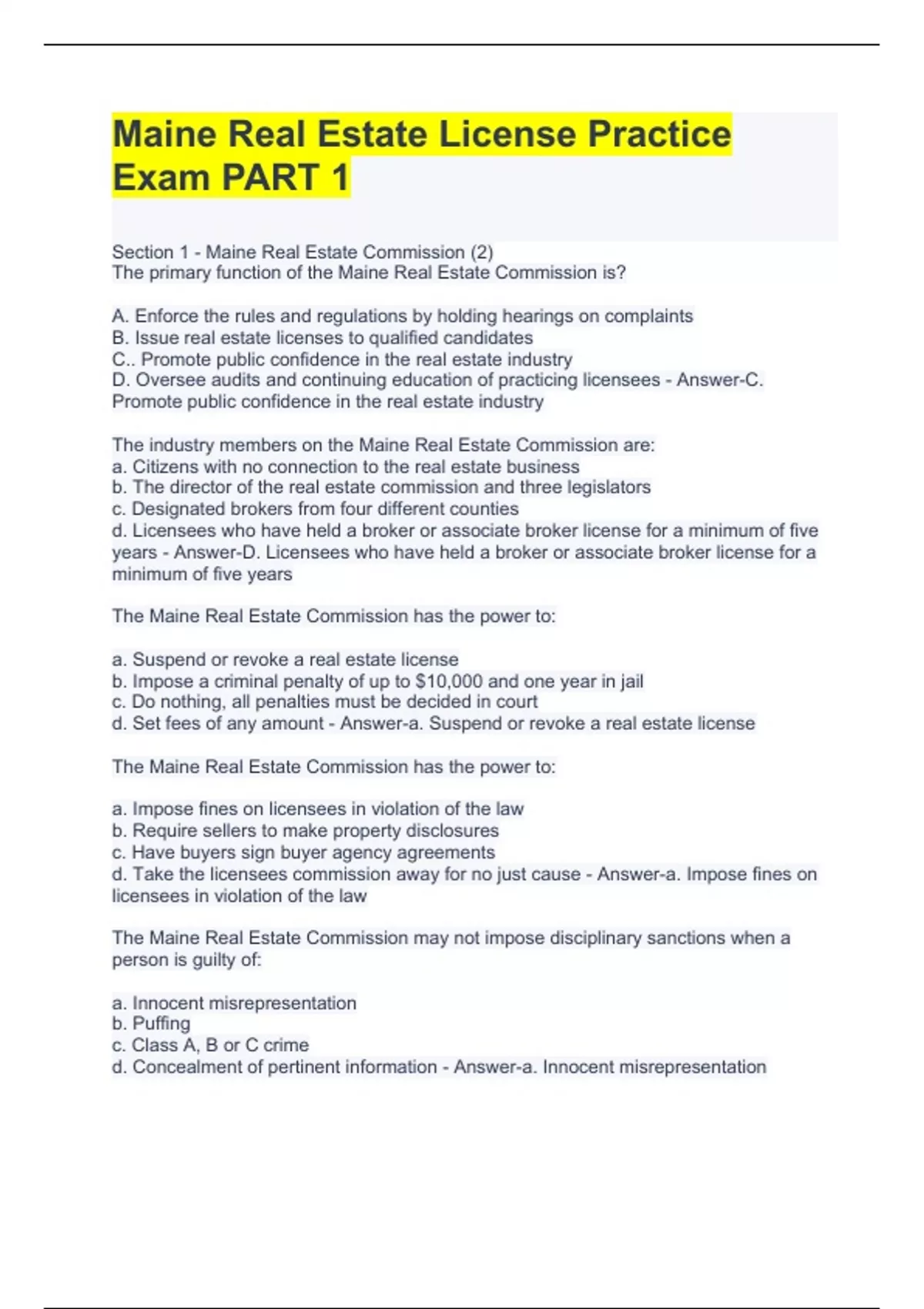 Section 1 - Maine Real Estate Commission (2) The primary function of the Maine Real Estate Commission is? A. Enforce the rules and regulations by holding hearings on complaints B. Issue real estate licenses to qualified candidates C.. Promote public confidence in the real estate industry D. Oversee audits and continuing education of practicing licensees - Answer-C. Promote public confidence in the real estate industry The industry members on the Maine Real Estate Commission are: a. Citizens with no connection to the real estate business b. The director of the real estate commission and three legislators c. Designated brokers from four different counties d. Licensees who have held a broker or associate broker license for a minimum of five years - Answer-D. Licensees who have held a broker or associate broker license for a minimum of five years The Maine Real Estate Commission has the power to: a. Suspend or revoke a real estate license b. Impose a criminal penalty of up to $10,000 and one year in jail c. Do nothing, all penalties must be decided in court d. Set fees of any amount - Answer-a. Suspend or revoke a real estate license The Maine Real Estate Commission has the power to: a. Impose fines on licensees in violation of the law b. Require sellers to make property disclosures c. Have buyers sign buyer agency agreements d. Take the licensees commission away for no just cause - Answer-a. Impose fines on licensees in violation of the law The Maine Real Estate Commission may not impose disciplinary sanctions when a person is guilty of: a. Innocent misrepresentation b. Puffing c. Class A, B or C crime d. Concealment of pertinent information - Answer-a. Innocent misrepresentation Iris Clover has been an active Associate Broker licensee in Maine for nine years. She may a. Open her own real estate brokerage company b. Serve on the Maine Real Estate Commission as an industry member c. Not apply for the broker license for 1 more year d. Not provide a broker price opinion for a bank - Answer-b. Serve on the Maine Real Estate Commission as an industry member The Maine Real Estate Commission has how many members? a. 4 b. 6 c. 5 d. 7 - Answer-B. 6 The Maine Real Estate Commission has how many industry members? a. 2 b. 4 c. 6 d. 8 - Answer-B. 4 A licensee may lose their license for conduct which shows a. Dishonesty b. Dealing in bad faith c. Incompetency d. All of the above - Answer-D. All of the above. Dishonest, dealing in bad faith, incompetency