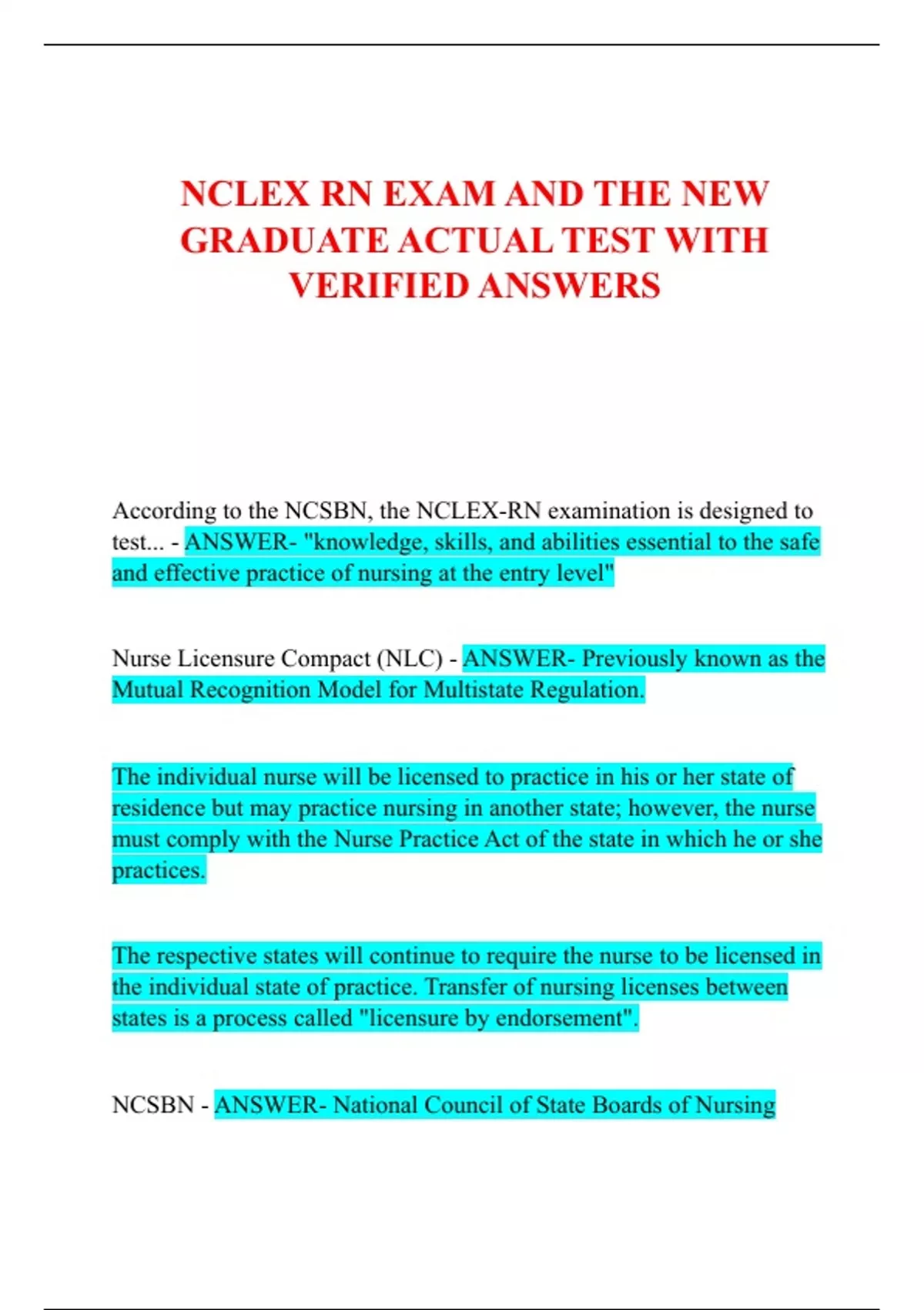 NCLEX RN EXAM AND THE NEW GRADUATE ACTUAL TEST WITH VERIFIED ANSWERS