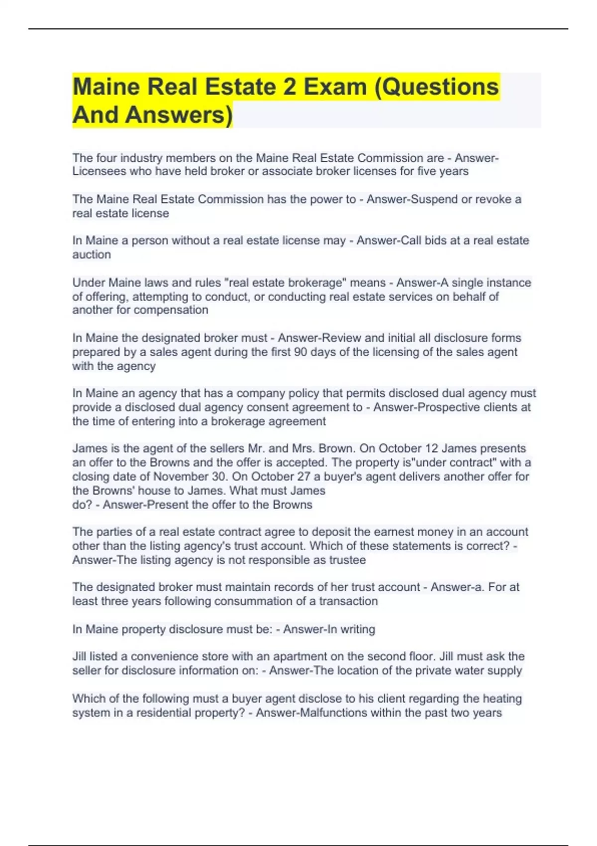 The four industry members on the Maine Real Estate Commission are - Answer-Licensees who have held broker or associate broker licenses for five years The Maine Real Estate Commission has the power to - Answer-Suspend or revoke a real estate license In Maine a person without a real estate license may - Answer-Call bids at a real estate auction Under Maine laws and rules "real estate brokerage" means - Answer-A single instance of offering, attempting to conduct, or conducting real estate services on behalf of another for compensation In Maine the designated broker must - Answer-Review and initial all disclosure forms prepared by a sales agent during the first 90 days of the licensing of the sales agent with the agency In Maine an agency that has a company policy that permits disclosed dual agency must provide a disclosed dual agency consent agreement to - Answer-Prospective clients at the time of entering into a brokerage agreement James is the agent of the sellers Mr. and Mrs. Brown. On October 12 James presents an offer to the Browns and the offer is accepted. The property is"under contract" with a closing date of November 30. On October 27 a buyer's agent delivers another offer for the Browns' house to James. What must James do? - Answer-Present the offer to the Browns The parties of a real estate contract agree to deposit the earnest money in an account other than the listing agency's trust account. Which of these statements is correct? - Answer-The listing agency is not responsible as trustee The designated broker must maintain records of her trust account - Answer-a. For at least three years following consummation of a transaction In Maine property disclosure must be: - Answer-In writing Jill listed a convenience store with an apartment on the second floor. Jill must ask the seller for disclosure information on: - Answer-The location of the private water supply Which of the following must a buyer agent disclose to his client regarding the heating system in a residential property? - Answer-Malfunctions within the past two years Information regarding the location of a leach field must be disclosed to the buyer: - Answer-Prior to or during the preparation of an offer The seller has no information or knowledge regarding hazardous waste on his residential property. Which statement is true? - Answer-The fact that information regarding hazardous material is not available shall be conveyed in writing In Maine which of the following is INCORRECT regarding the payment of a real estate commission? - Answer-A listing Agent can receive an additional commission amount from the buyer without disclosing that fact to the seller In Maine what statement best describes what a licensee should do when rendering an opinion of value to a client: - Answer-
