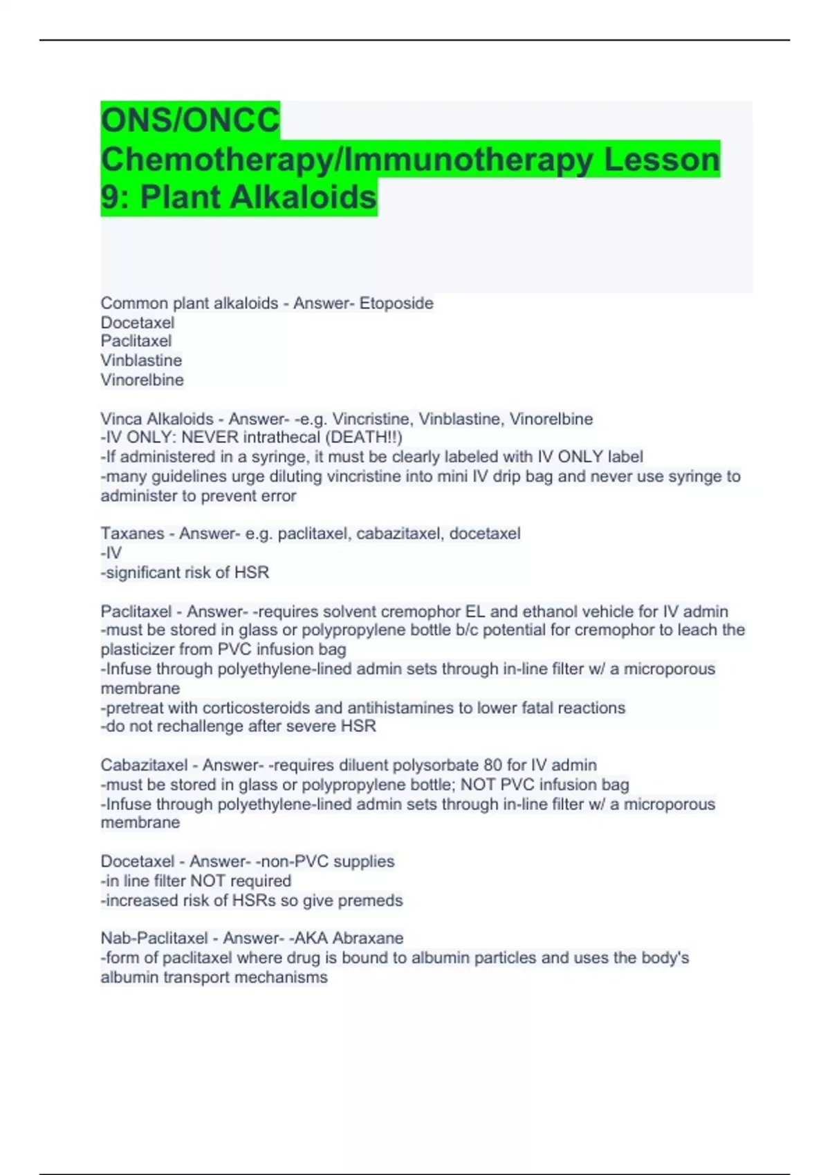 ONS ONCC Chemotherapy Immunotherapy Lesson 9 Plant Alkaloids Exam Questions and Answers