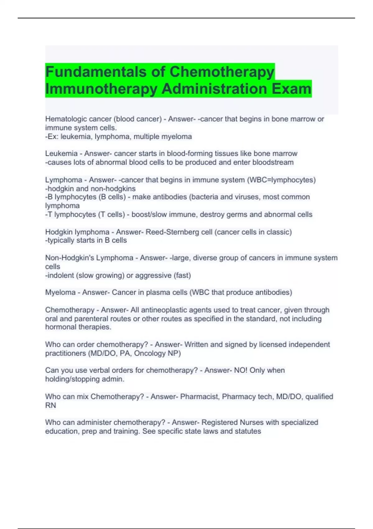 Fundamentals of Chemotherapy Immunotherapy Administration Exam Questions with correct Answers