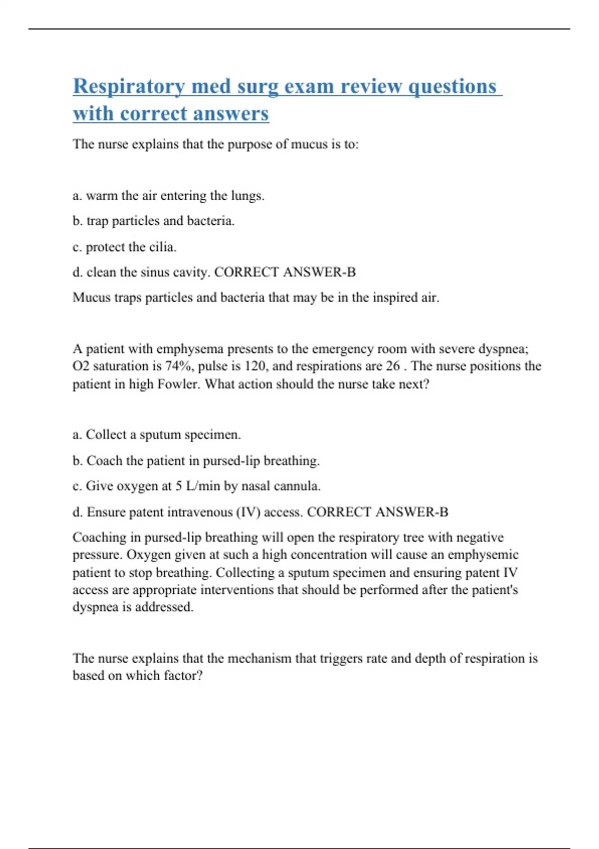 The nurse explains that the purpose of mucus is to: a. warm the air entering the lungs. b. trap particles and bacteria. c. protect the cilia. d. clean the sinus cavity. CORRECT ANSWER-B Mucus traps particles and bacteria that may be in the inspired air. A patient with emphysema presents to the emergency room with severe dyspnea; O2 saturation is 74%, pulse is 120, and respirations are 26 . The nurse positions the patient in high Fowler. What action should the nurse take next? a. Collect a sputum specimen. b. Coach the patient in pursed-lip breathing. c. Give oxygen at 5 L/min by nasal cannula. d. Ensure patent intravenous (IV) access. CORRECT ANSWER-B Coaching in pursed-lip breathing will open the respiratory tree with negative pressure. Oxygen given at such a high concentration will cause an emphysemic patient to stop breathing. Collecting a sputum specimen and ensuring patent IV access are appropriate interventions that should be performed after the patient's dyspnea is addressed. The nurse explains that the mechanism that triggers rate and depth of respiration is based on which factor?