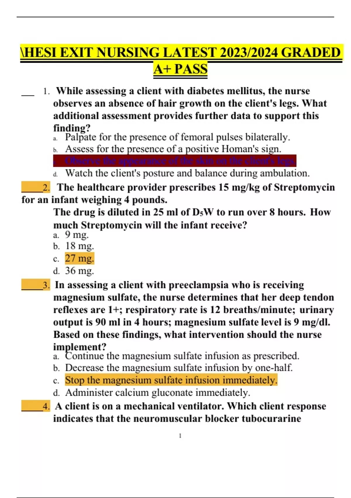 HESI EXIT NURSING LATEST 2023/2024 GRADED A+ PASS 1. While assessing a client with diabetes mellitus, the nurse observes an absence of hair growth on the client's legs. What additional assessment provides further data to support this finding? a.Palpate for the presence of femoral pulses bilaterally. b.Assess for the presence of a positive Homan's sign. c.Observe the appearance of the skin on the client's legs. d.Watch the client's posture and balance during ambulation. 2. The healthcare provider prescribes 15 mg/kg of Streptomycin for an infant weighing 4 pounds. The drug is diluted in 25 ml of D5W to run over 8 hours. How much Streptomycin will the infant receive? a.9 mg. b.18 mg. c.27 mg. d.36 mg. 3. In assessing a client with preeclampsia who is receiving magnesium sulfate, the nurse determines that her deep tendon reflexes are 1+; respiratory rate is 12 breaths/minute; urinary output is 90 ml in 4 hours; magnesium sulfate level is 9 mg/dl. Based on these findings, what intervention should the nurse implement? a.Continue the magnesium sulfate infusion as prescribed. b.Decrease the magnesium sulfate infusion by one-half. c.Stop the magnesium sulfate infusion immediately. d.Administer calcium gluconate immediately. 4. A client is on a mechanical ventilator. Which client response indicates that the neuromuscular blocker tubocurarine chloride (Tubarine) is effective? a.The client’s expremities are paralyzed. b.The peripheral nerve stimulator causes twitching. c.The client clinches fist upon command.