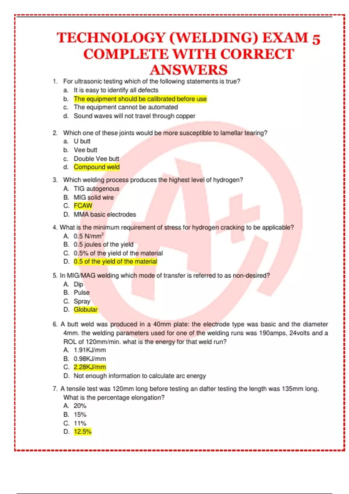 TECHNOLOGY (WELDING) EXAM 5 COMPLETE WITH CORRECT ANSWERS 1. For ultrasonic testing which of the following statements is true? a. It is easy to identify all defects b. The equipment should be calibrated before use c. The equipment cannot be automated d. Sound waves will not travel through copper 2. Which one of these joints would be more susceptible to lamellar tearing? a. U butt b. Vee butt c. Double Vee butt d. Compound weld