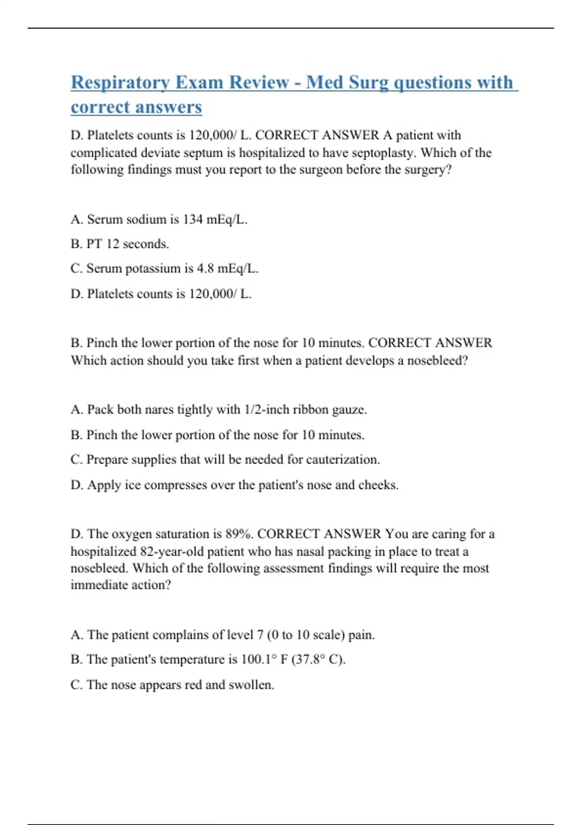 D. Platelets counts is 120,000/ L. CORRECT ANSWER A patient with complicated deviate septum is hospitalized to have septoplasty. Which of the following findings must you report to the surgeon before the surgery? A. Serum sodium is 134 mEq/L. B. PT 12 seconds. C. Serum potassium is 4.8 mEq/L. D. Platelets counts is 120,000/ L. B. Pinch the lower portion of the nose for 10 minutes. CORRECT ANSWER Which action should you take first when a patient develops a nosebleed? A. Pack both nares tightly with 1/2-inch ribbon gauze. B. Pinch the lower portion of the nose for 10 minutes. C. Prepare supplies that will be needed for cauterization. D. Apply ice compresses over the patient's nose and cheeks. D. The oxygen saturation is 89%. CORRECT ANSWER You are caring for a hospitalized 82-year-old patient who has nasal packing in place to treat a nosebleed. Which of the following assessment findings will require the most immediate action? A. The patient complains of level 7 (0 to 10 scale) pain. B. The patient's temperature is 100.1° F (37.8° C). C. The nose appears red and swollen.