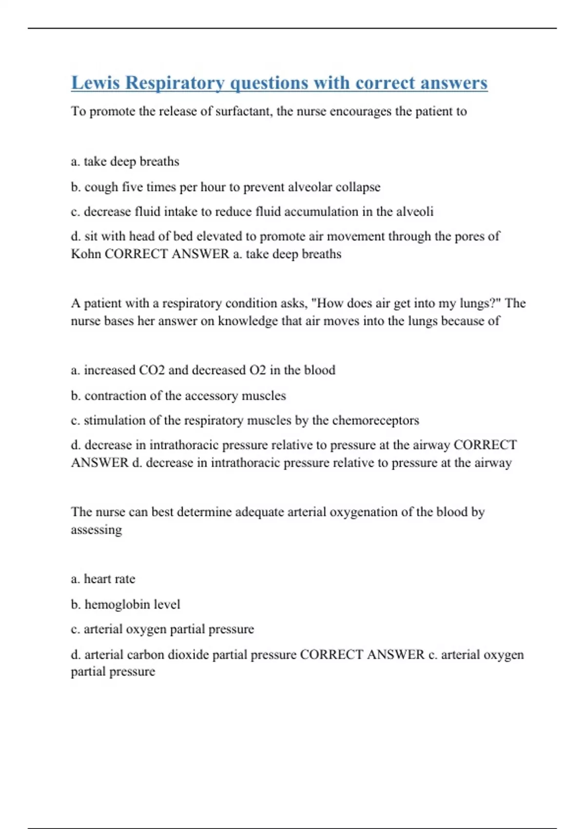 To promote the release of surfactant, the nurse encourages the patient to a. take deep breaths b. cough five times per hour to prevent alveolar collapse c. decrease fluid intake to reduce fluid accumulation in the alveoli d. sit with head of bed elevated to promote air movement through the pores of Kohn CORRECT ANSWER a. take deep breaths A patient with a respiratory condition asks, "How does air get into my lungs?" The nurse bases her answer on knowledge that air moves into the lungs because of a. increased CO2 and decreased O2 in the blood b. contraction of the accessory muscles c. stimulation of the respiratory muscles by the chemoreceptors d. decrease in intrathoracic pressure relative to pressure at the airway CORRECT ANSWER d. decrease in intrathoracic pressure relative to pressure at the airway The nurse can best determine adequate arterial oxygenation of the blood by assessing a. heart rate b. hemoglobin level c. arterial oxygen partial pressure d. arterial carbon dioxide partial pressure CORRECT ANSWER c. arterial oxygen partial pressure