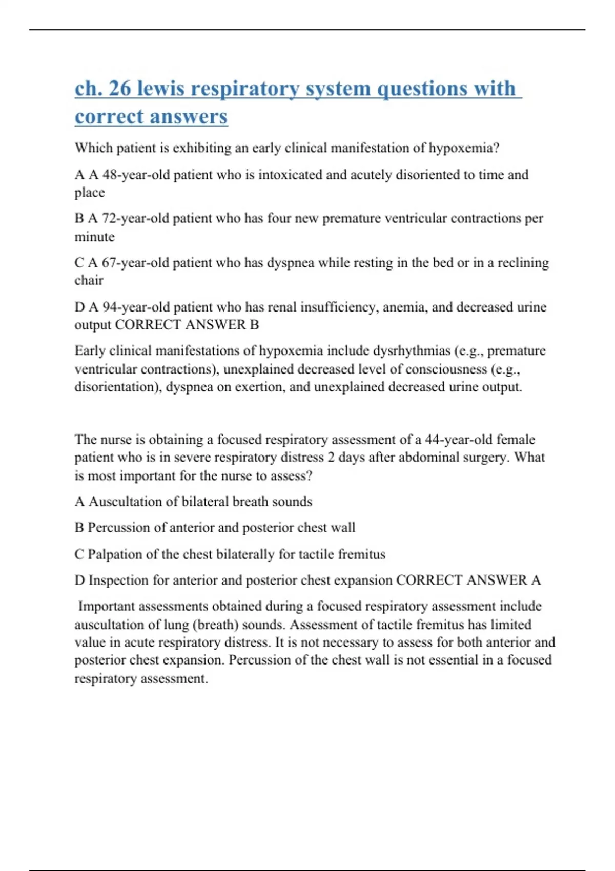 Which patient is exhibiting an early clinical manifestation of hypoxemia? A A 48-year-old patient who is intoxicated and acutely disoriented to time and place B A 72-year-old patient who has four new premature ventricular contractions per minute C A 67-year-old patient who has dyspnea while resting in the bed or in a reclining chair D A 94-year-old patient who has renal insufficiency, anemia, and decreased urine output CORRECT ANSWER B Early clinical manifestations of hypoxemia include dysrhythmias (e.g., premature ventricular contractions), unexplained decreased level of consciousness (e.g., disorientation), dyspnea on exertion, and unexplained decreased urine output. The nurse is obtaining a focused respiratory assessment of a 44-year-old female patient who is in severe respiratory distress 2 days after abdominal surgery. What is most important for the nurse to assess? A Auscultation of bilateral breath sounds B Percussion of anterior and posterior chest wall C Palpation of the chest bilaterally for tactile fremitus D Inspection for anterior and posterior chest expansion CORRECT ANSWER A Important assessments obtained during a focused respiratory assessment include auscultation of lung (breath) sounds. Assessment of tactile fremitus has limited value in acute respiratory distress. It is not necessary to assess for both anterior and posterior chest expansion. Percussion of the chest wall is not essential in a focused respiratory assessment.