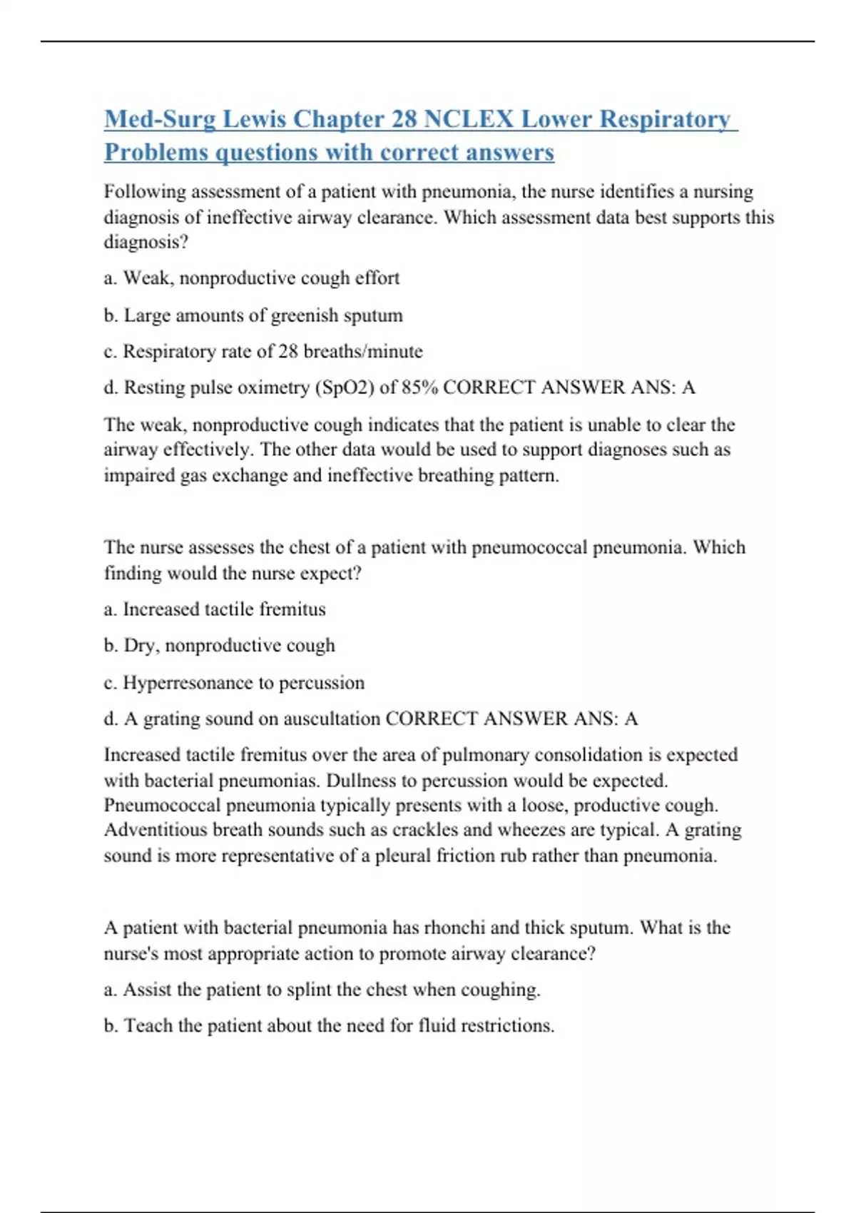 Following assessment of a patient with pneumonia, the nurse identifies a nursing diagnosis of ineffective airway clearance. Which assessment data best supports this diagnosis? a. Weak, nonproductive cough effort b. Large amounts of greenish sputum c. Respiratory rate of 28 breaths/minute d. Resting pulse oximetry (SpO2) of 85% CORRECT ANSWER ANS: A The weak, nonproductive cough indicates that the patient is unable to clear the airway effectively. The other data would be used to support diagnoses such as impaired gas exchange and ineffective breathing pattern. The nurse assesses the chest of a patient with pneumococcal pneumonia. Which finding would the nurse expect? a. Increased tactile fremitus b. Dry, nonproductive cough c. Hyperresonance to percussion d. A grating sound on auscultation CORRECT ANSWER ANS: A Increased tactile fremitus over the area of pulmonary consolidation is expected with bacterial pneumonias. Dullness to percussion would be expected. Pneumococcal pneumonia typically presents with a loose, productive cough. Adventitious breath sounds such as crackles and wheezes are typical. A grating sound is more representative of a pleural friction rub rather than pneumonia. A patient with bacterial pneumonia has rhonchi and thick sputum. What is the nurse's most appropriate action to promote airway clearance? a. Assist the patient to splint the chest when coug