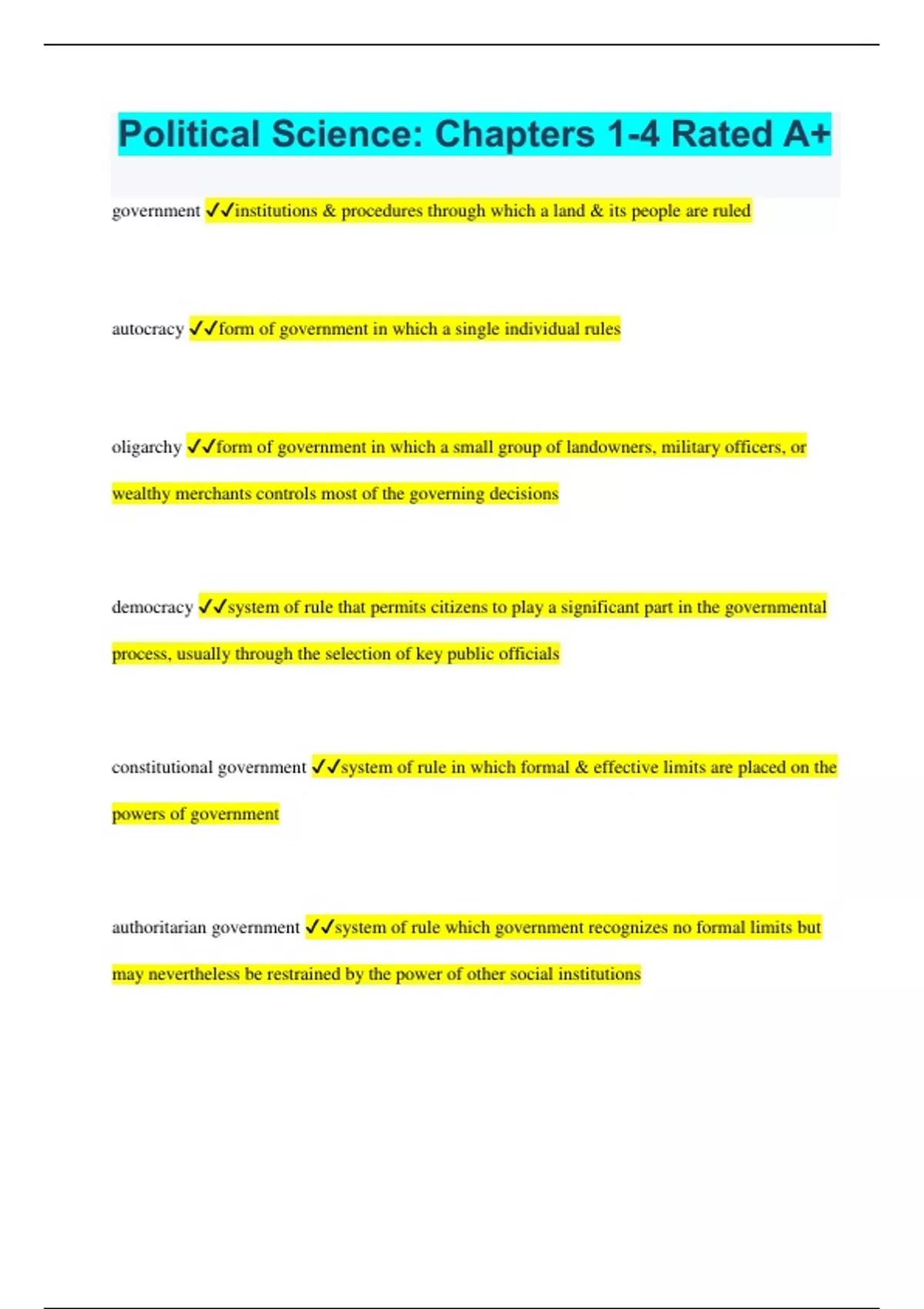 Political Science: Chapters 1-4 Rated A+ government institutions & procedures through which a land & its people are ruled autocracy form of government in which a single individual rules oligarchy form of government in which a small group of landowners, military officers, or wealthy merchants controls most of the governing decisions democracy system of rule that permits citizens to play a significant part in the governmental process, usually through the selection of key public officials constitutional government system of rule in which formal & effective limits are placed on the powers of government authoritarian government system of rule which government recognizes no formal limits but may nevertheless be restrained by the power of other social institutions totalitarian government system of rule in which government recognizes no formal limits on its power & seeks to absorb or eliminate other social institutions that might challenge it coercion forcing a person to do something by threats or pressure free riding enjoying the benefits of some good or action while letting others bear the cost public goods a good that may be enjoyed by anyone if it is provided & may not be denied to anyone once provided (collective good) politics conflict, struggle, cooperation & collaboration over the leadership, structure & policies of government institutions the rules & procedures that provide incentives for political behavior, thereby shaping politics principal- agent relationships relationship between a principal and his/her agent. This relationship may be affected by the fact that each is motivated by self-intrest, yet their interests may not be well aligned Articles of Confederation & Perpetual Union America's first written constitution adopted by the continental congress in 1777. These were the formal basis for Americas national government until 1789 , when they were superseded by the constitution The Great Compromise an agreement reached at the constitutional convention of 1787 that gave each state an equal number of senators regardless of its population but linked representation in the House of Representatives to the population three-fifths compromise an agreement reached at the constitutional convention of 1787 stipulating that for purposes of the apportionment of congressional seats, every slave would be counted as 3/5 of a person bicameralism the division of a legislative body into two chambers or houses expressed powers the powers ENUMERATED in the constitution that ARE GRANTED to the federal government necessary & proper clause Article 1 Section 8, of the constitution which enumerates the powers of congress & provides congress with the authority to make all laws "necessary & proper" to carry them out; also referred to as the elastic clause judicial review powers of the courts to declare actions of the legislative & executive branches invalid or unconstitutional. the supreme court asserted this power in the Marbury v. Madison (1803) supremacy clause a clause of Article VI of the constitution that states that all laws passed by the national gov. & all treaties are the supreme laws of the land & superior to all laws adopted by any state or any subdivision separation of powers division of governmental powers among several institutions that must cooperate in decision making federalism the system of government in which a constitution divides power between a central government & regional government Bill of Rights the first 10 amendments to the US constitution adopted in 1791. this insures certain rights & liberties to the people checks & balances mechanisms through which each branch of government is able to participate in & influence the activities of other branches // limits power federalists those who favored a strong national government & supported the constitution purposed at the American Constitutional Convention of 1787 antifederalists those who favored strong state governments & a weak national government & who were opponents of the constitutional convention of 1787 implied powers powers derived from the necessary & proper clause (Article 1, Section 8) of the constitution. such powers are not specifically expressed but are implied through the expansive interpretations of delegated powers reserved powers powers derived from the 10th Amendment to the constitution that are not specifically delegated to the national government or denied to the states; these powers are reserved to the states eminent domain the right of the government to take private property for public use, with reasonable compensation awarded for the property concurrent powers authority possessed by both state & national governments, such as the power to levy taxes full faith & credit clause the provisions in Article IV Section 1, of the constitution requiring that each state normally honors the public acts & judicial decisions that take place in another state privileges & immunities clause the provision from Article IV Section 2, of the constitution that a state cannot discriminate against someone from another state or give its own residents special privileges home rule power delegated by the state to a local unit of government to manage its own affairs dual federalism system of government that prevailed in the US from in which most fundamental governmental powers were shared between the federal & state government with the sates exercising the most important powers commerce clause the clause found in Article 1Section 8 of the constitution which delegates to congress the powers "to regulate commerce with foreign Nations & among the several states & with the Indian tribes this clause was interpreted by the supreme court to favor national power over the economy cooperative federalism type of federalism existing since the New Deal era in which grants-in-aid have been used strategically to encourage states & localities (w/out commanding them) to pursue nationally defined goals. also known as the intergovernmental cooperation grants-in-