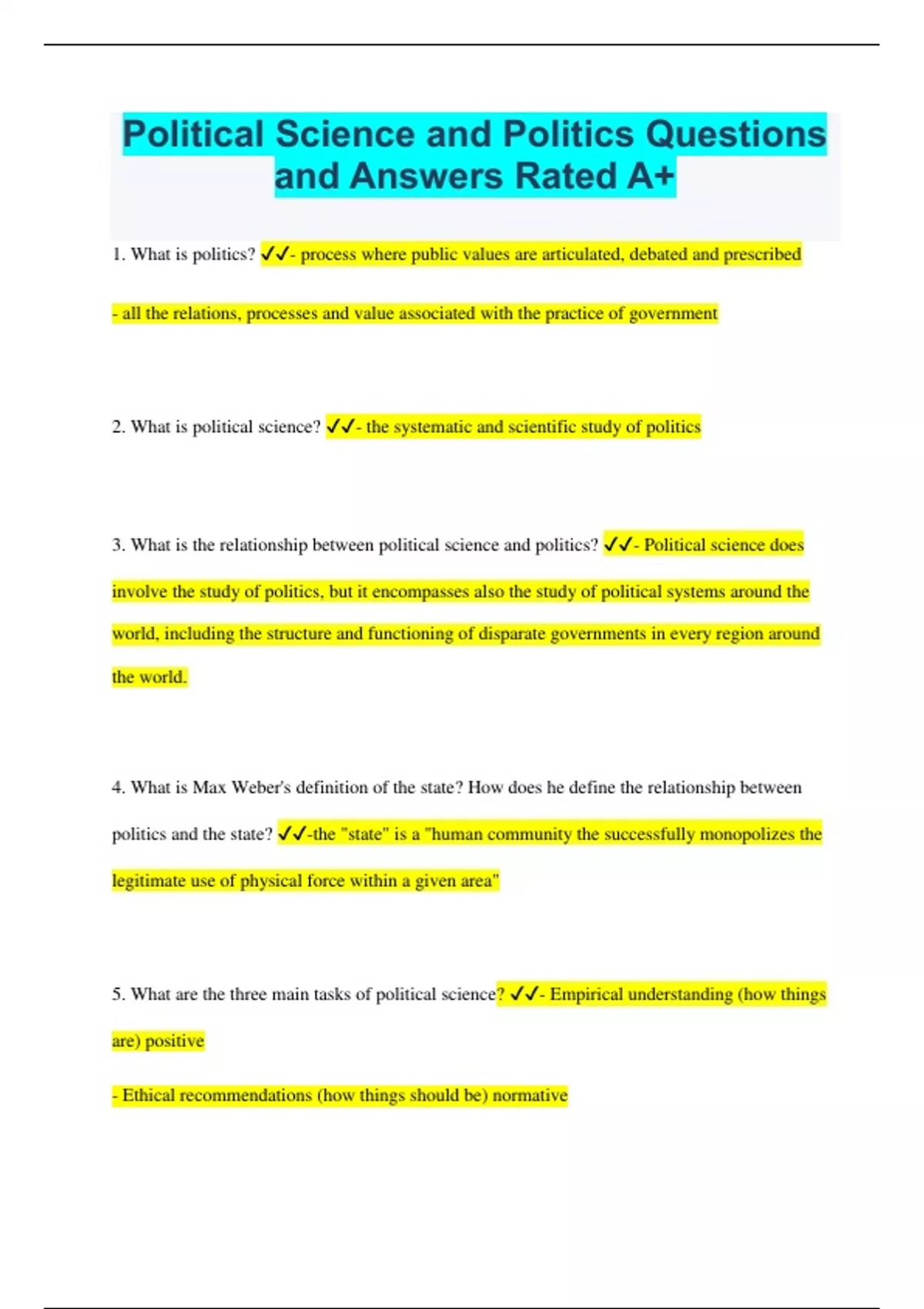 Political Science and Politics Questions and Answers Rated A+ 1. What is politics? - process where public values are articulated, debated and prescribed - all the relations, processes and value associated with the practice of government 2. What is political science? - the systematic and scientific study of politics 3. What is the relationship between political science and politics? - Political science does involve the study of politics, but it encompasses also the study of political systems around the world, including the structure and functioning of disparate governments in every region around the world. 4. What is Max Weber's definition of the state? How does he define the relationship between politics and the state? -the "state" is a "human community the successfully monopolizes the legitimate use of physical force within a given area" 5. What are the three main tasks of political science? - Empirical understanding (how things are) positive - Ethical recommendations (how things should be) normative - Prudential judgment (how things can be done) 6. How do the tasks of political science relate to each other? -The concepts of 'state' and 'politics' are linked -the state is a relation of men dominating men, a relation sported by means of legitimate... violence" 7. What does each task of political science entail? -Empirical understanding: when political scientists try to understand how the world is through scientific approach. -Ethical recommendations: how things should be, 'what ought to be?" question for good political life, names and describes political values and whats to achieve them without being strictly limited to eachother -Prudential judgment: what can be, or "sensible guidance in political life". Incorporating lessons form the things we know, practical wisdom, in order to form realistic public policies. 8. What are the seven steps of scientific inquiry? - Formulate a research question - Developing a theory - Identifying the variables - Operationalizing the variables - Generalizing hypothesis - Testing the hypothesis with evidence - Recording the results 9. What is positivism? - Knowledge can only be derived from observation 10. What is behavioralism? - approach to social science that emphasizes empirically observable patterns of behavior - purpose of scientific inquiry 11. What are the main sub-disciplines of political science? - Political theory - American politics - Comparative politics - International relations 12. Which of the three main tasks of political science does each sub-discipline perform? - Ethical PS: sets goals - Empirical PS: asses the reality of politics - Prudential PS: makes recommendations for improving the reality of politics and for accomplishing goals