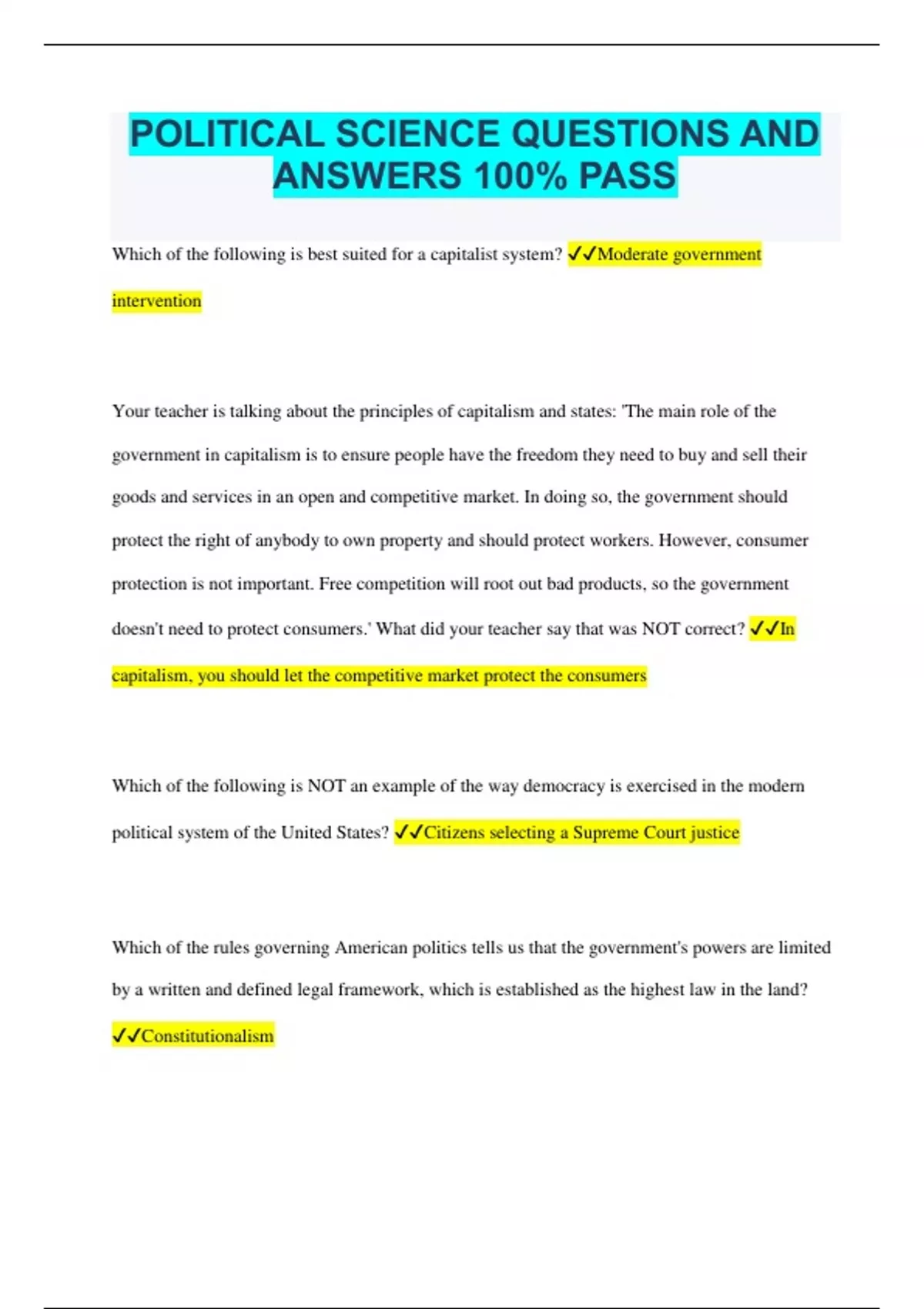 POLITICAL SCIENCE QUESTIONS AND ANSWERS 100% PASS Which of the following is best suited for a capitalist system? Moderate government intervention Your teacher is talking about the principles of capitalism and states: 'The main role of the government in capitalism is to ensure people have the freedom they need to buy and sell their goods and services in an open and competitive market. In doing so, the government should protect the right of anybody to own property and should protect workers. However, consumer protection is not important. Free competition will root out bad products, so the government doesn't need to protect consumers.' What did your teacher say that was NOT correct? In capitalism, you should let the competitive market protect the consumers Which of the following is NOT an example of the way democracy is exercised in the modern political system of the United States? Citizens selecting a Supreme Court justice Which of the rules governing American politics tells us that the government's powers are limited by a written and defined legal framework, which is established as the highest law in the land? Constitutionalism Which of the following goals do the rules of American politics accomplish? All the answers are correct. After a long, heated debate, the U.S. Congress has managed to agree upon two final versions of a gun control bill. However, each version has several contradicting stipulations. According to majoritarianism, what would be the best way to resolve the situation? A referendum where the American people would choose The _____ theory of political power asserts that people who have the most resources have the most political power and make decisions for society. Elitism Which of the following theories states that political power should be held by groups? Pluralism A foreign country complains that you are emitting excessive greenhouse gases and not taking into account environmental sustainability. Which of the following could be used to defend your rule over your territory? The principle of total sovereignty Which of the following refers to an individual's or group's right to use power by making decisions, giving directives, and demanding compliance? Authority Which of the following statements is true? In a democracy, citizens must be treated with respect and be able to voice their opinions without feeling intimidated. In a representative democracy, _____. The members of a society vote for leaders to represent them in the decisions and actions of the political process. Which statement best describes democracy? A democracy is a type of government or political system ruled by citizens who take an active role in the political process. In a direct democracy, _____. every member of the society participates directly in the political process Which of the following is a basic principle of democracy? All of the answers are correct Which of the following refers to voter participation? The number of voters who cast a ballot in an election Which of the following best defines the ability of individuals and groups to create and enforce policies and manage public resources? Political power Which of the following is a current trend in American politics? The shift in political power from the majority of voters to a few specific groups You are a respected member of the community who has volunteered at the local dog shelter for many years. You minored in political science and have an M.B.A. in economics. You decide you want to run for political office. As you have been working as a teacher, you don't have that much money, nor connections to donors. Which of the following is a factor that might hamper your campaign? Not having the funds to finance your campaign may be a significant problem Tom is campaigning for the California fifth district. He is attempting to speak to his entire potential constituency. One of his voters is only interested in the legalization of soft drugs and does not care about any other aspects of Tom's policy. He doesn't even care if such a policy would have a negative impact on the state. Which of the following best describes such a voter? A single-issue voter Which of the following documents served as our nation's first constitution? The Articles of Confederation Which