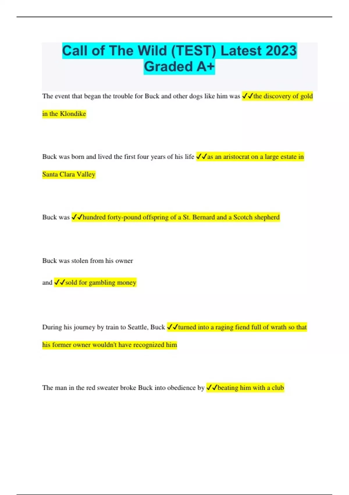 Call of The Wild (TEST) Latest 2023 Graded A+ The event that began the trouble for Buck and other dogs like him was the discovery of gold in the Klondike Buck was born and lived the first four years of his life as an aristocrat on a large estate in Santa Clara Valley Buck was hundred forty-pound offspring of a St. Bernard and a Scotch shepherd Buck was stolen from his owner and sold for gambling money During his journey by train to Seattle, Buck turned into a raging fiend full of wrath so that his former owner wouldn't have recognized him The man in the red sweater broke Buck into obedience by beating him with a club Perrault, the French-Canadian who was Buck's first owner, wanted the best dogs because he he had the job of courier of important dispatches for the government One of the dogs that traveled aboard the Narwhal with Buck was killed by thirty or forty huskies that waited in a circle around her when the dog she was fighting knocked her off her feet Buck soon learned that his new life was ruled by the law of club and fang After watching Spitz take part in the killing of another dog, how did Buck feel about the lead sled-dog? Buck felt a bitter and deathless hatred for the dog. Buck and the other dogs slept warmly in the cold by Buck and the other dogs slept warmly in the cold by digging and curling up in a hole that filled with their own body heat Which of the following behaviors was not the result of Buck's cruel treatment and decivilization in the Northland? He lost interest in the food he was offered and the work he was expected to do for men One of the deadly dangers that François, Perrault, and the sled-dogs faced on their travels was breaking through the ice on frozen lakes and rivers The sled dogs, including Buck felt ride in being in the traces and doing their work Most of the food and equipment that François and Perrault carried were destroyed when they were attacked by a band of starving huskies from an Indian village How did François solve the problem of Buck's injured feet, which were not so compact and hard as those of the huskies? He made moccasins for the dog Under the fierce conditions of trail life with François and Perrault, he dominant primordial beast, already strong in Buck, secretly grewishing During the run up the Yukon, Buck slyly lead a revolt among the sled-dogs against Spitz The fight to the death between Spitz and Buck resulted in Spitz's death and Buck's gaining the position of lead dog When the government ordered Buck and his mates into the service of a Scotch halfbreed, François called Buck, threw his arms around the dog, and wept over him On his journey back to Dawson while sleeping before the fire, Buck had visions of a hairy man who did not stand erect and great beasts of prey circling in the darkness. When it was obvious that Dave the sled dog was dying, the men considered it a mercy to allow him to die running in the traces Which of the following was not true of Buck and his mates by the time they had finished their thirty-day delivery of the Salt Water Mail into Skaguay? The number of men rushing into the Klondyke and the volume of mail the dogs were expected to deliver had greatly decreased When Charles, Hal, and Mercedes first tried to leave Skaguay with Buck and his team the sled was foolishly overloaded and badly packed After their journey with Charles and his companions, Buck and the remaining four dogs were no more than skeletons John Thornton gained possession of Buck by stopping the beating Hal was giving Buck and threatening to kill Hal if he struck the dog again. When the long winter nights came, Buck could be seen running at the head of a wolf pack, his great throat a-bellow. Hal, Charles, Mercedes, and the four dogs fell through the ice and disappeared into the White River In the summers a large wolf entered the valley where the Yeehats believed an Evil Spirit lived, to stop by a yellow stream where he mused for a time, gave one, long, mournful howl, and then departed Buck experienced love for the first time with John Thornton Some Yeehats hunters were found with their throats slashed open and huge wolf prints about them in the snow Unlike other men who cared for their dogs out of a sense of business and duty, John Thornton treated his dogs like they were his own children Which of the following was not true of the stories told by the Yeehats? There was a great dog spirit that had come to live among them Buck expressed his affection for Thornton by a feigned bite on the man's hand Buck answered the call of the wild by joining a pack of timber wolves To show his affection for Buck, Thornton had a habit of taking the dog's head between his hands and shaking him With the death of John Thornton the last tie that bound him to Man was broken It was Buck's feelings for Thornton that kept him from turning his back on the fire and answering the luring call that sounded from the fores Because of his love for John Thornton, Buck ripped the throats of the Yeehats, causing them to flee in terror When Thornton was struck by a evil-tempered man in a bar, Buck leaped on the man and tore open his throat. Upon returning to camp from hunting and killing a large moose, Buck found that Thornton, his partners, and the other dogs had been attacked and killed by Yeehats Once Buck broke three ribs saving his master from a roaring stream What Thornton and his partners did not see when Buck left camp was the terrible transformation that took place in the dog Thornton made a bet that Buck could break out, walk off with, and pull a sled loaded with a thousand pounds As Thornton and his partners worked, Buck took to staying away from camp for days, hunting and killing his own food What words did Thornton whisper into Buck's ear as the dog stood ready to win sixteen hundred dollars for his master? "As you love me, Buck. As you love me." After running with the wild timber wolf, Buck returned to camp and sprang upon John Thornton in a frenzy of affection The wi