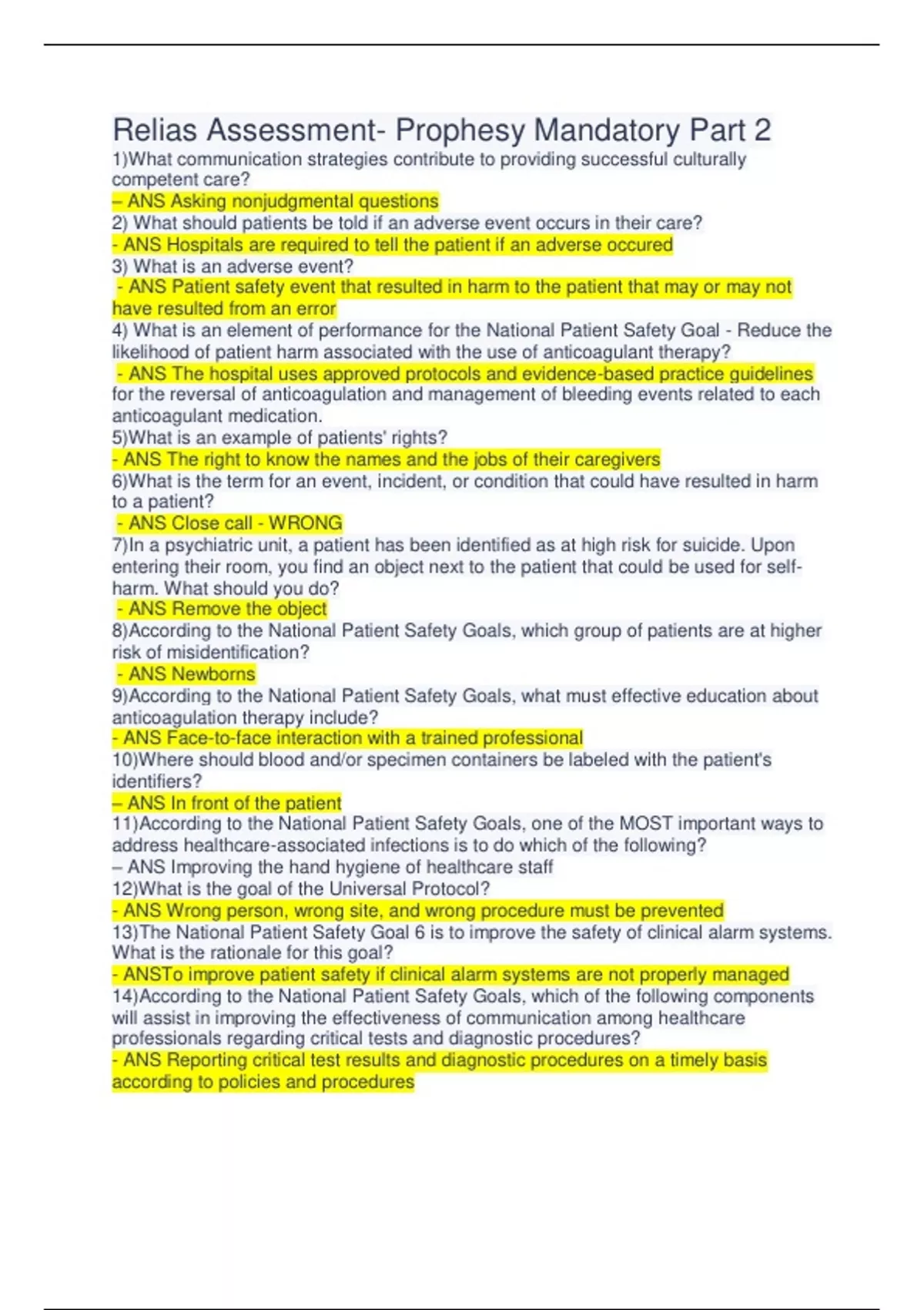 Relias Assessment- Prophesy Mandatory Part 2 1)What communication strategies contribute to providing successful culturally competent care? – ANS Asking nonjudgmental questions 2) What should patients be told if an adverse event occurs in their care? - ANS Hospitals are required to tell the patient if an adverse occured 3) What is an adverse event? - ANS Patient safety event that resulted in harm to the patient that may or may not have resulted from an error 4) What is an element of performance for the National Patient Safety Goal - Reduce the likelihood of patient harm associated with the use of anticoagulant therapy? - ANS The hospital uses approved protocols and evidence-based practice guidelines for the reversal of anticoagulation and management of bleeding events related to each anticoagulant medication. 5)What is an example of patients' rights? - ANS The right to know the names and the jobs of their caregivers 6)What is the term for an event, incident, or condition that could have resulted in harm to a patient? - ANS Close call - WRONG 7)In a psychiatric unit, a patient has been identified as at high risk for suicide. Upon entering their room, you find an object next to the patient that could be used for selfharm. What should you do? - ANS Remove the object 8)According to the National Patient Safety Goals, which group of patients are at higher risk of misidentification? - ANS Newborns 9)According to the National Patient Safety Goals, what must effective education about anticoagulation therapy include? - ANS Face-to-face interaction with a trained professional 10)Where should blood and/or specimen containers be labeled with the patient's identifiers? – ANS In front of the patient...