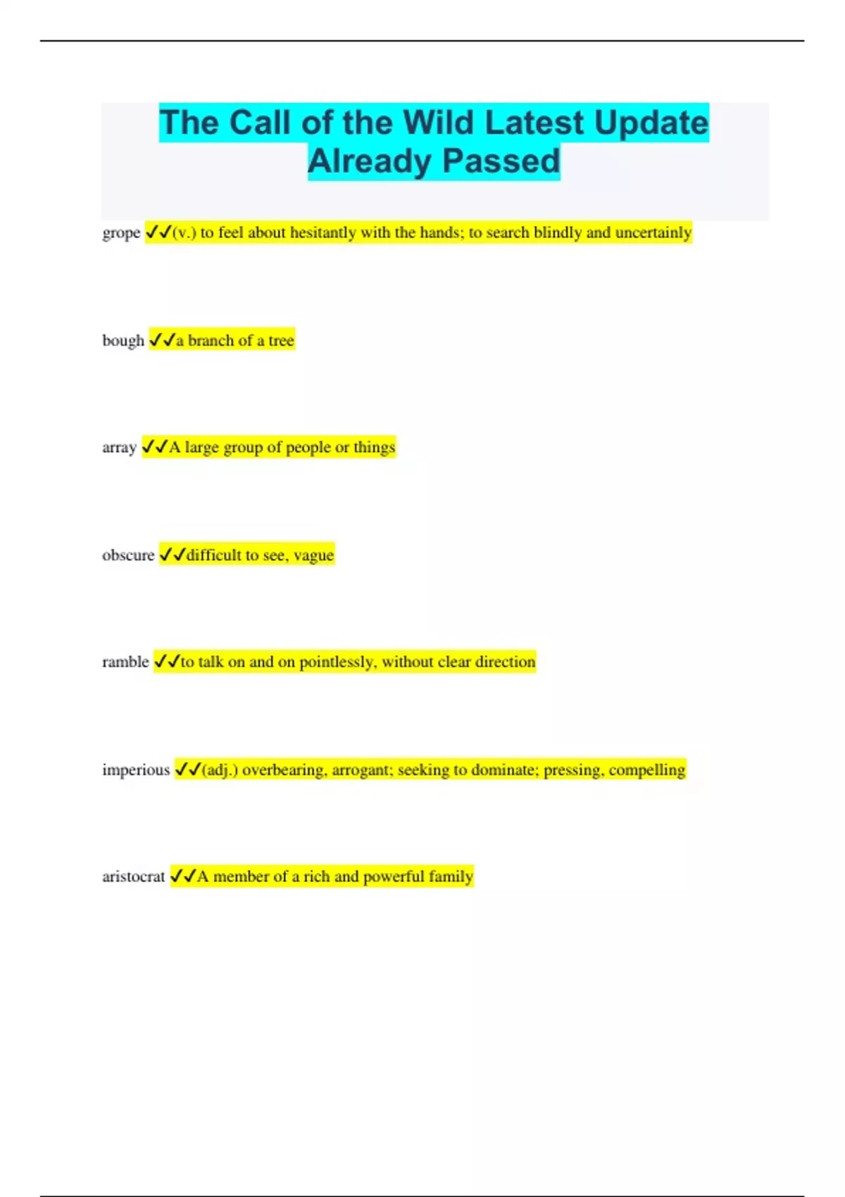 The Call of the Wild Latest Update Already Passed grope (v.) to feel about hesitantly with the hands; to search blindly and uncertainly bough a branch of a tree array A large group of people or things obscure difficult to see, vague ramble to talk on and on pointlessly, without clear direction imperious (adj.) overbearing, arrogant; seeking to dominate; pressing, compelling aristocrat A member of a rich and powerful family insular (adj.) relating to, characteristic of, or situated on an island; narrow or isolated in outlook or experience kindred having similar origin, nature, or character progeny offspring; children treachery betrayal of trust solitary being alone; lacking the company of others affirmative agreeing with; supporting futile useless; hopeless vile extremely unpleasant wrath intense anger oppress to govern or rule cruelly or unjustly; to weigh heavily upon calamity a serious event causing distress or misfortune sullen bad-tempered and sulky; gloomy assail attack, assault Protagonist of the story Buck Buck's original owner whom he was kidnapped from Judge Miller Fair to Buck; helped him become a great sled dog Francois Man who almost beat Buck to death Hal Saved Buck and Buck truly loved him John Thornton Buck's rival, whom he defeated to become lead dog Spitz Irish Setter; John Thornton's dog; kind and caring Skeet People responsible for killing John Thornton Yeehats Selfish woman who eventually drown Mercedes Taught Buck to respect the club The man in the red sweater How did Buck quickly learn about the law of club and fang? Curly was killed after approaching another dog. What made Buck initially hate Spitz? Spitz laughed when Curly was killed How did Dave assist Buck when they were harnessed? He nipped Buck's hind quarters when he made an error. Why did Buck feel he should be in the lead dog position? He had earned the position by defeating Spitz. What does Buck often dream of, symbolizing his return to a more primitive state? A prehistoric man