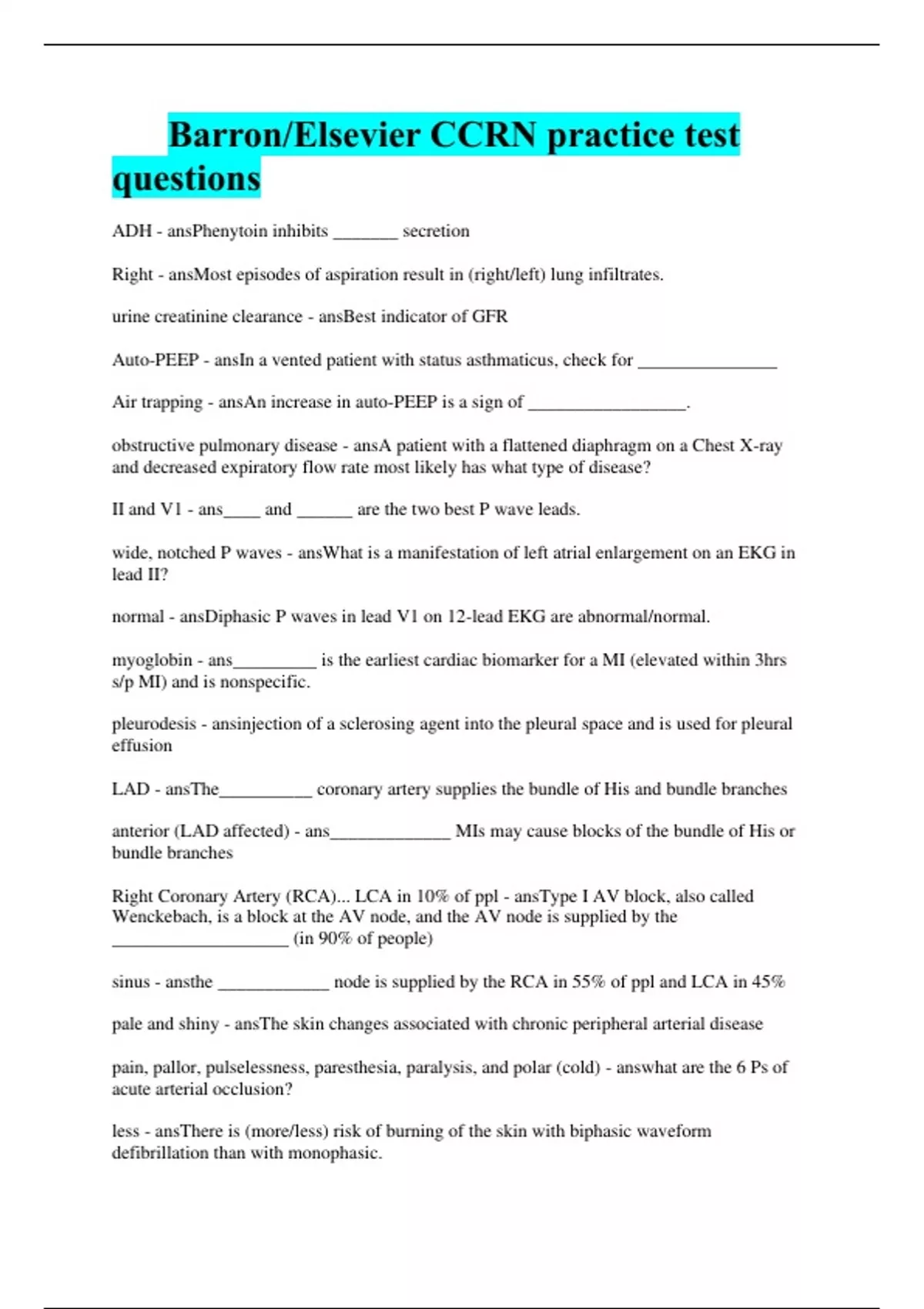 ADH - ansPhenytoin inhibits _______ secretion Right - ansMost episodes of aspiration result in (right/left) lung infiltrates. urine creatinine clearance - ansBest indicator of GFR Auto-PEEP - ansIn a vented patient with status asthmaticus, check for _______________ Air trapping - ansAn increase in auto-PEEP is a sign of _________________. obstructive pulmonary disease - ansA patient with a flattened diaphragm on a Chest X-ray and decreased expiratory flow rate most likely has what type of disease? II and V1 - ans____ and ______ are the two best P wave leads. wide, notched P waves - ansWhat is a manifestation of left atrial enlargement on an EKG in lead II? normal - ansDiphasic P waves in lead V1 on 12-lead EKG are abnormal/normal. myoglobin - ans_________ is the earliest cardiac biomarker for a MI (elevated within 3hrs s/p MI) and is nonspecific. pleurodesis - ansinjection of a sclerosing agent into the pleural space and is used for pleural effusion LAD - ansThe__________ coronary artery supplies the bundle of His and bundle branches anterior (LAD affected) - ans_____________ MIs may cause blocks of the bundle of His or bundle branches Right Coronary Artery (RCA)... LCA in 10% of ppl - ansType I AV block, also called Wenckebach, is a block at the AV node, and the AV node is supplied by the ___________________ (in 90% of people) sinus - ansthe ____________ node is supplied by the RCA in 55% of ppl and LCA in 45% pale and shiny - ansThe skin changes associated with chronic peripheral arterial disease pain, pallor, pulselessness, paresthesia, paralysis, and polar (cold) - answhat are the 6 Ps of acute arterial occlusion? less - ansThere is (more/less) risk of burning of the skin with biphasic waveform defibrillation than with monophasic.
