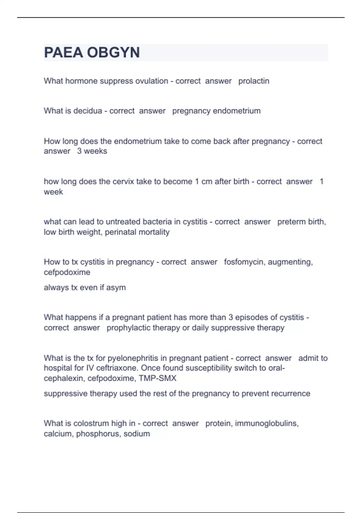 PAEA OBGYN Question and answers already passed 2023/2024What hormone suppress ovulation - correct answer prolactin What is decidua - correct answer pregnancy endometrium How long does the endometrium take to come back after pregnancy - correct answer 3 weeks how long does the cervix take to become 1 cm after birth - correct answer 1 week what can lead to untreated bacteria in cystitis - correct answer preterm birth, low birth weight, perinatal mortality How to tx cystitis in pregnancy - correct answer fosfomycin, augmenting, cefpodoxime always tx even if asym What happens if a pregnant patient has more than 3 episodes of cystitis - correct answer