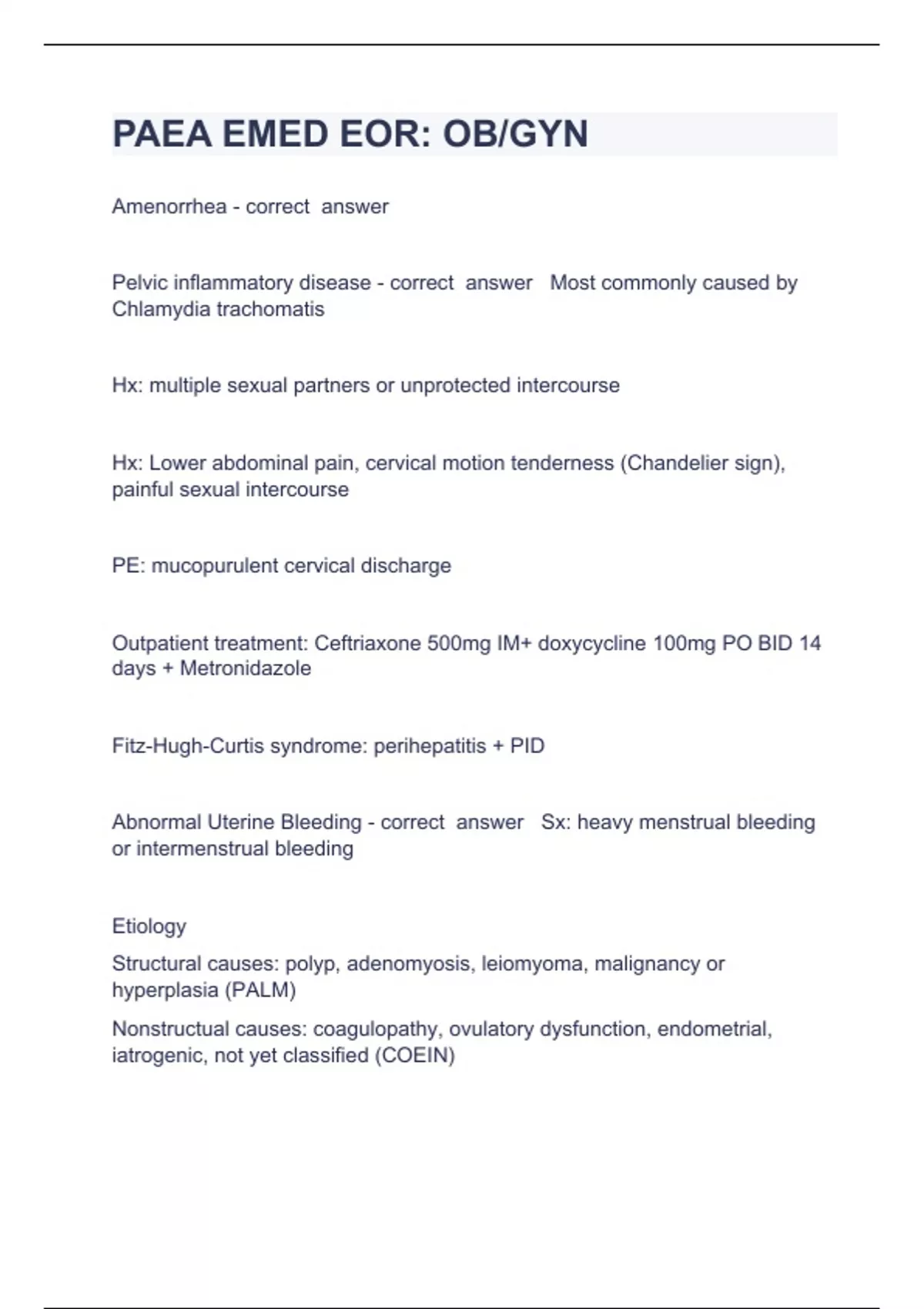 PAEA EMED EOR Question and answers 100% correct 2023/2024Amenorrhea - correct answer Pelvic inflammatory disease - correct answer Most commonly caused by Chlamydia trachomatis Hx: multiple sexual partners or unprotected intercourse Hx: Lower abdominal pain, cervical motion tenderness (Chandelier sign), painful sexual intercourse PE: mucopurulent cervical discharge Outpatient treatment: Ceftriaxone 500mg IM+ doxycycline 100mg PO BID 14 days + Metronidazole Fitz-Hugh-Curtis syndrome: perihepatitis + PID Abnormal U