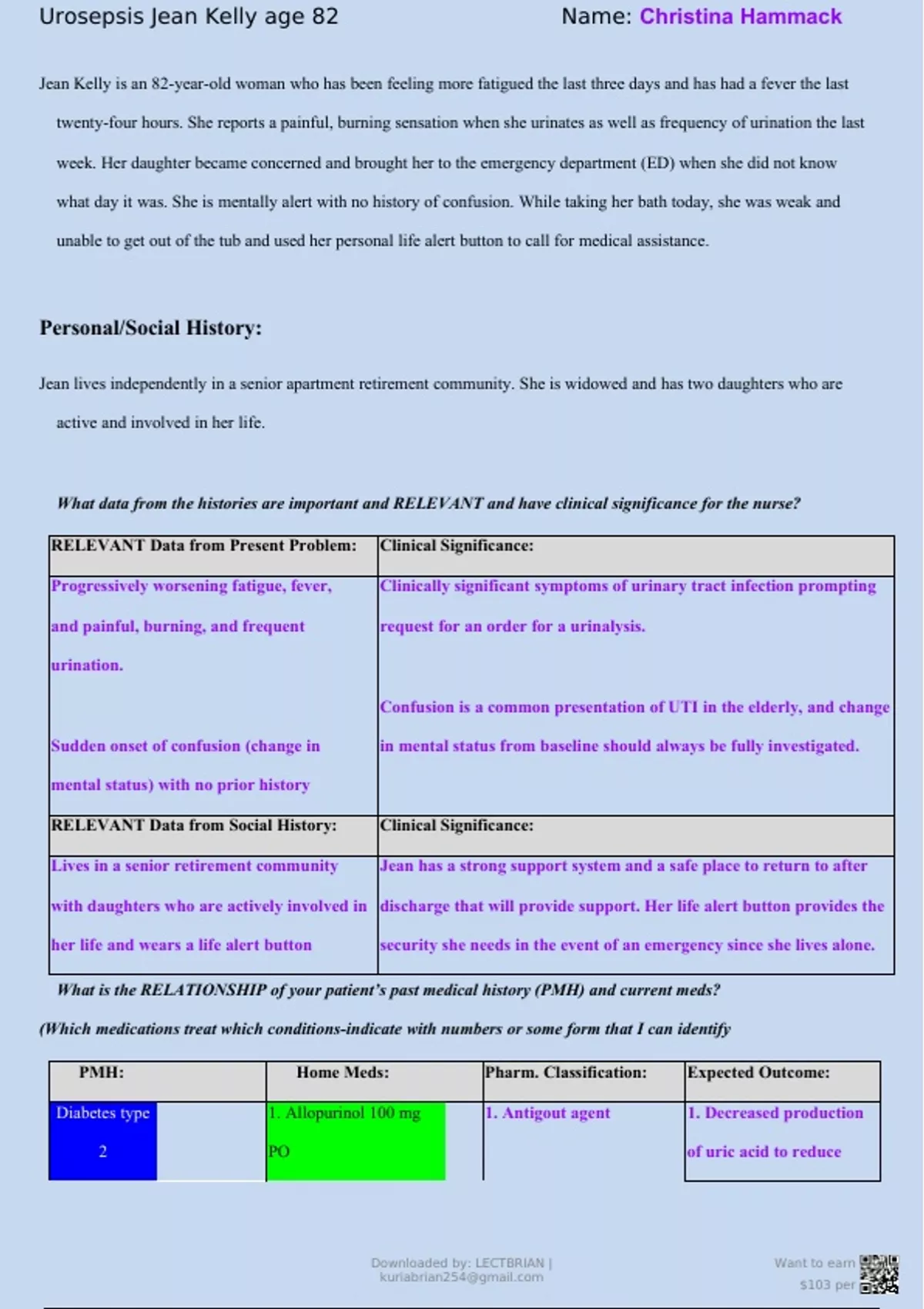 Sepsis/Urosepsis Case Study (Jean Kelly is an 82 years old) Jean Kelly is an 82-year-old woman who has been feeling more fatigued the last three days (Answered) UPDATE