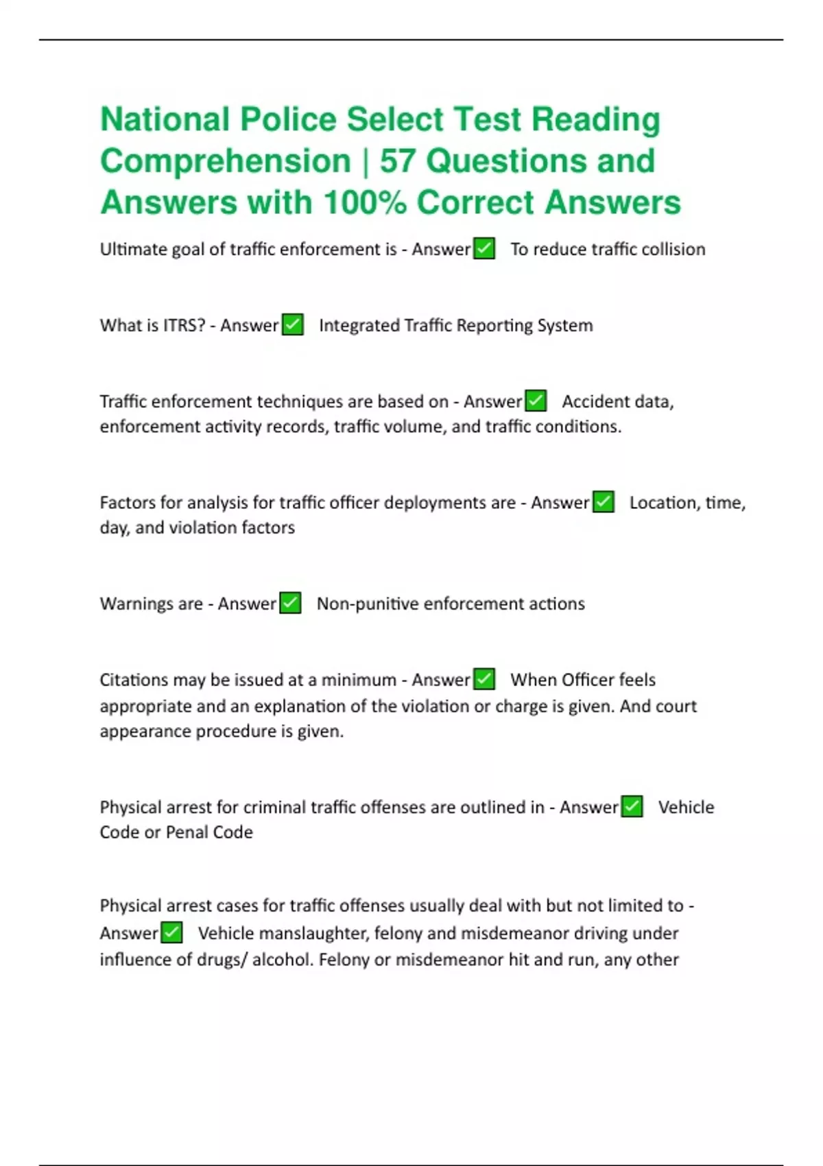 National Police Select Test Reading Comprehension | 57 Questions and Answers with 100% Correct Answers Ultimate goal of traffic enforcement is - Answer To reduce traffic collision What is ITRS? - Answer Integrated Traffic Reporting System Traffic enforcement techniques are based on - Answer Accident data, enforcement activity records, traffic volume, and traffic conditions. Factors for analysis for traffic officer deployments are - Answer Location, time, day, and violation factors Warnings are - Answer Non -punitive enforcement actions Citations may be issued at a minimum - Answer When Officer feels appropriate and an explanation of the violation or charge is given. And court appearance procedure is given. Physical arrest for criminal traffic offenses are outlined in - Answer Vehicle Code or Penal Code Physical arrest cases for traffic offenses usually deal with but not limited to - Answer Vehicle manslaughter, felony and misdemeanor driving under influence of drugs/ alcohol. Felony or misdemeanor hit and run, any other misdemeanor at the discretion of the officer I.e reckless driving with extenuating circumstances The term Serious Injury is defined as - Answer Any injury that may result in a fatality Dismissal of citations once issued - Answer Can only be dismissed by court authority. A drivers license suspended for suspect of DUI under any following circumstances - Answer 1) arrestee refuses to chemical test 2) arrestee fails to complete selected test 3) declines breathe teat and demands blood or urine tests and reasonable belief that Blood Alcohol content BAC exceed .08% level 4) complete breathe tests and show a BAC of .08% or higher Zero tolerance requires a preliminary alcohol tests (PAS) for underage - Answer Of .01% or greater to suspend COPPS or - Answer Community Oriented Policing and Problem Solving Response to Incidents (R2I) is primarily oriented to - Answer Reacting to criminal or emergency events that have occurred Term R/O or responding officer refers to - Answer Police case reporting in a traditional law enforcement setting