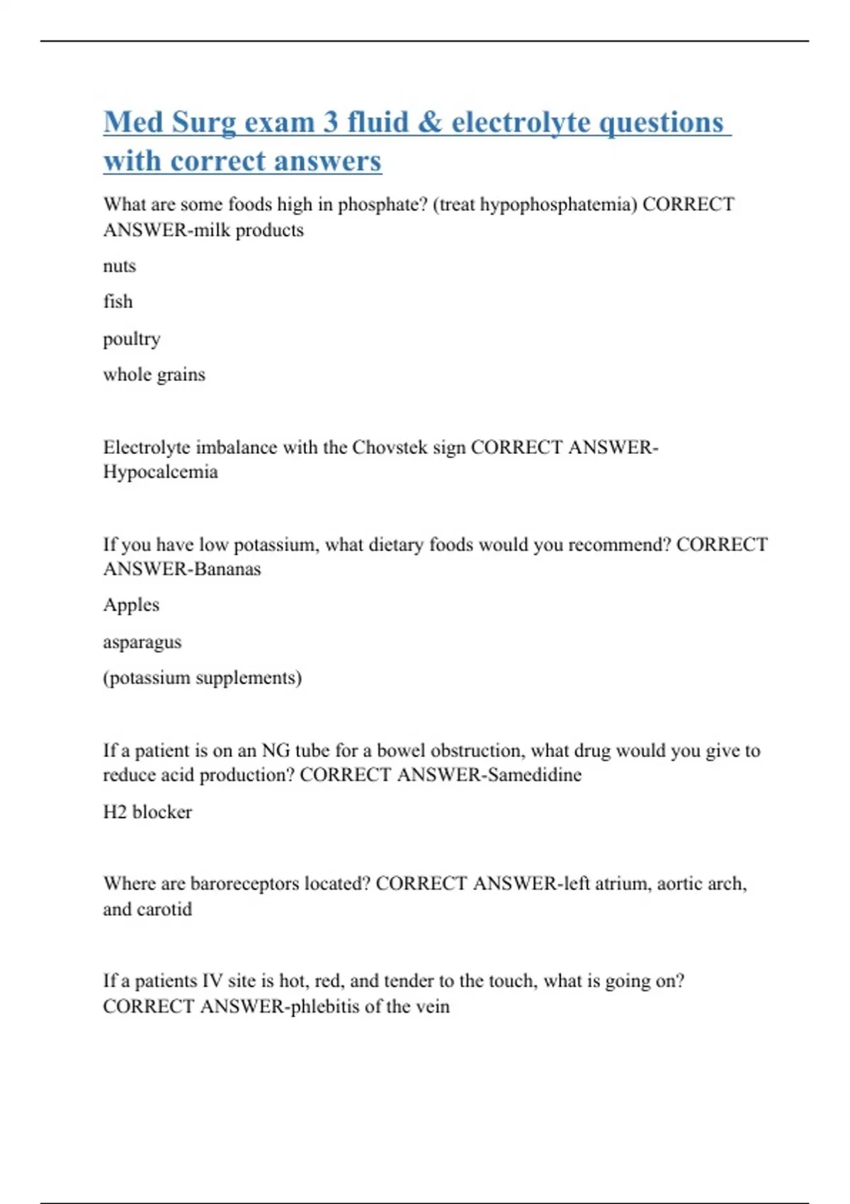 What are some foods high in phosphate? (treat hypophosphatemia) CORRECT ANSWER-milk products nuts fish poultry whole grains Electrolyte imbalance with the Chovstek sign CORRECT ANSWER-Hypocalcemia If you have low potassium, what dietary foods would you recommend? CORRECT ANSWER-Bananas Apples asparagus (potassium supplements) If a patient is on an NG tube for a bowel obstruction, what drug would you give to reduce acid production? CORRECT ANSWER-Samedidine H2 blocker Where are baroreceptors located? CORRECT ANSWER-left atrium, aortic arch, and carotid If a patients IV site is hot, red, and tender to the touch, what is going on? CORRECT ANSWER-phlebitis