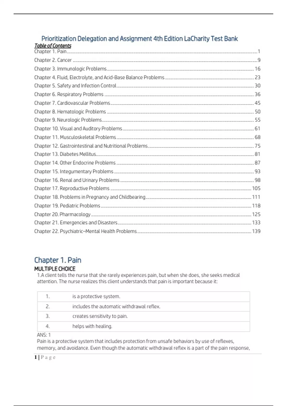 Test Bank Prioritization Delegation and Assignment 4th Edition LaCharityTable of Contents Chapter 1. Pain ............................................................................................................................................................. 1 Chapter 2. Cancer ........................................................................................................................................................ 9 Chapter 3. Immunologic Problems ......................................................................................................................... 16 Chapter 4. Fluid, Electrolyte, and Acid-Base Balance Problems ......................................................................... 23 Chapter 5. Safety and Infection Control ................................................................................................................. 30 Chapter 6. Respiratory Problems ........................................................................................................................... 36 Chapter 7. Cardiovascular Problems ...................................................................................................................... 45 Chapter 8. Hematologic Problems ......................................................................................................................... 50 Chapter 9. Neurologic Problems ............................................................................................................................. 55 Chapter 10. Visual and Auditory Problems ............................................................................................................ 61 Chapter 11. Musculoskeletal Problems ................................................................................................................. 68 Chapter 12. Gastrointestinal and Nutritional Problems ....................................................................................... 75 Chapter 13. Diabetes Mellitus.................................................................................................................................. 81 Chapter 14. Other Endocrine Problems ................................................................................................................. 87 Chapter 15. Integumentary Problems ................................................................................................................... 93 Chapter 16. Renal and Urinary Problems .............................................................................................................. 98 Chapter 17. Reproductive Problems .................................................................................................................... 105 Chapter 18. Problems in Pregnancy and Childbearing ....................................................................................... 111 Chapter 19. Pediatric Problems ............................................................................................................................ 118 Chapter 20. Pharmacology .................................................................................................................................... 125 Chapter 21. Emergencies and Disasters .............................................................................................................. 133 Chapter 22. Psychiatric–Mental Health Problems .............................................................................................. 139 Chapter 1. Pain MULTIPLE CHOICE 1.A client tells the nurse that she rarely experiences pain, but when she does, she seeks medical attention. The nurse realizes this client understands that pain is important because it: 1. 2. 3. 4. is a protective system. includes the automatic withdrawal reflex. creates sensitivity to pain. helps with healing. ANS: 1 Pain is a protective system that includes protection from unsafe behaviors by use of reflexes, memory, and avoidance. Even though the automatic withdrawal reflex is a part of the pain response, 1 | P a g eit does not explain why pain is important. Pain does not create sensitivity to pain. Pain does not help with healing. PTS: 1 DIF: Analyze REF: Definitions and Implications of Pain 2.A client complains that the bed sheets touching his skin are extremely painful. The nurse realizes this client is experiencing: 1. 2. 3. 4. allodynia. modulation. kinesthesia. proprioception. ANS: 1 Allodynia or hyperalgesia is a state where a slight or nonpainful stimulus is interpreted as very painful. Kinesthesia is the awareness of movement. Proprioception is the awareness of body position. Modulation is an influencing factor in the perception of pain. PTS: 1 DIF: Analyze REF: Peripheral Nervous System 3.A client is complaining of severe abdomen pain. The nurse realizes this client is experiencing which type of pain? 1. 2. 3. 4. Neuralgia Pathological Somatic Visceral ANS: 4 Visceral pain is pain arising from the body organs or gastrointestinal tract. Somatic pain is pain that originates from the bone, joints, muscles, skin, or connective pain. Neuralgia and pathological pain are both types of pain that result from injury to a nerve or malfunction of the neuronal transmission process or due to impaired regulation. PTS:1DIF:AnalyzeREF:Types of Pain 4.A client, diagnosed with acute appendicitis, is experiencing abdominal pain. The best way for the nurse to describe this clients pain would be: 1. 2. 3. 4. chronic. neuropathic. referred. acute. ANS: 4 Acute pain onset is sudden and of short duration. Chronic pain is a sudden or slow onset of mild to severe pain that lasts longer than 6 months. Referred pain is the result of the transfer of visceral pain sensations to a body surface at a distance from the actual origin. Neuropathic pain is paroxysmal pain that occurs along the branches of a nerve. PTS:1DIF:ApplyREF:Types of Pain 5.A client is observed holding a pillow over the abdominal region with both knees 