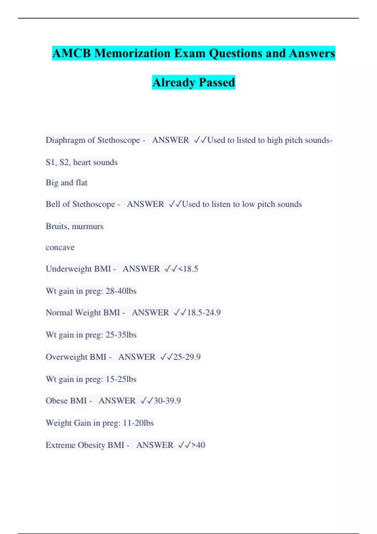 AMCB Memorization Exam Questions and Answers Already Passed Diaphragm of Stethoscope - ANSWER Used to listed to high pitch sounds-S1, S2, heart sounds Big and flat Bell of Stethoscope - ANSWER Used to listen to low pitch sounds Bruits, murmurs concave Underweight BMI - ANSWER 18.5 Wt gain in preg: 28-40lbs Normal Weight BMI - ANSWER 18.5-24.9 Wt gain in preg: 25-35lbs Overweight BMI - ANSWER 25-29.9 Wt gain in preg: 15-25lbs Obese BMI - ANSWER 30-39.9