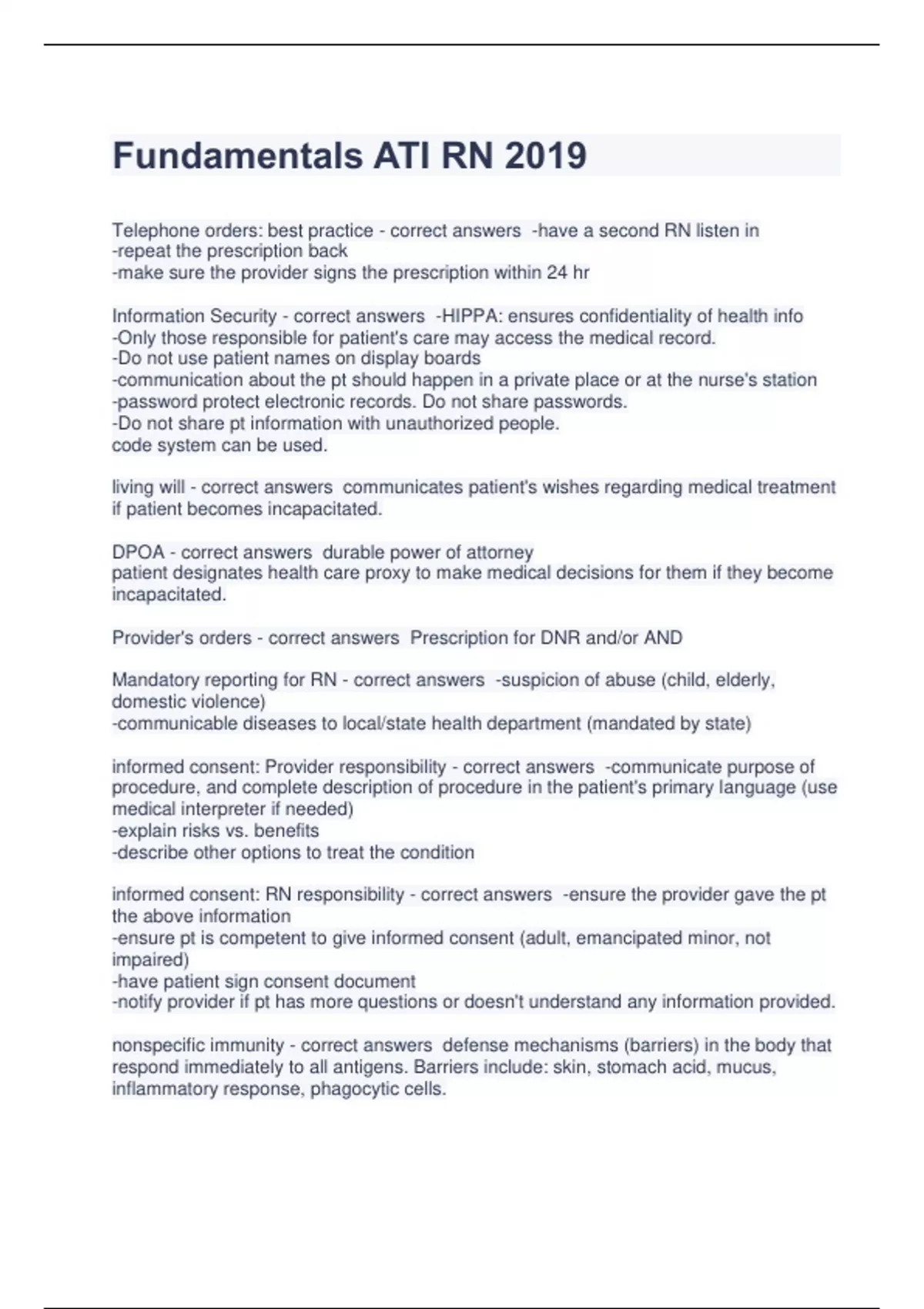 Fundamentals ATI RN 2019 Telephone orders: best practice - correct answers -have a second RN listen in -repeat the prescription back -make sure the provider signs the prescription within 24 hr Information Security - correct answers -HIPPA: ensures confidentiality of health info -Only those responsible for patient's care may access the medical record. -Do not use patient names on display boards -communication about the pt should happen in a private place or at the nurse's station -password protect electronic records. Do not share passwords. -Do not share pt information with unauthorized people. code system can be used. living will - correct answers communicates patient's wishes regarding medical treatment if patient becomes incapacitated. DPOA - correct answers durable power of attorney patient designates health care proxy to make medical decisions for them if they become incapacitated. Provider's orders - correct answers Prescription for DNR and/or AND Mandatory reporting for RN - correct answers -suspicion of abuse (child, elderly, domestic violence) -communicable diseases to local/state health department (mandated by state) informed consent: Provider responsibility - correct answers -communicate purpose of procedure, and complete description of procedure in the patient's primary language (use medical interpreter if needed) -explain risks vs. benefits -describe other options to treat the condition informed consent: RN responsibility - correct answers -ensure the provider gave the pt the above information -ensure pt is competent to give informed consent (adult, emancipated minor, not impaired) -have patient sign consent document -notify provider if pt has more questions or doesn't understand any information provided. nonspecific immunity - correct answers defense mechanisms (barriers) in the body that respond immediately to all antigens. Barriers include: skin, stomach acid, mucus, inflammatory response, phagocytic cells. specific adaptive immunity - correct answers body produces antibodies in response to a specific antigen through action of B and T lymphocytes. Requires more time, but the immune response against that antigen in the future is more efficient. incubation - correct answers time from when the pathogen enters the body until the first symptom appears. prodromal stage - correct answers time from the onset of general symptoms (malaise, fatigue) to specific symptoms. illness stage - correct answers time when specific symptoms occur convalescence - correct answers time from when symptoms disappear to complete recovery (can take months) primary prevention - correct answers prevents initial occurrence of disease ex: education, immunizations, prenatal classes secondary prevention - correct answers focuses on early detection of disease, limiting severity of disease. ex: screenings, control of outbreaks tertiary prevention - correct answers maximize recovery after injury /illness ex: rehab, PT/OT, support groups active natural immunity - correct answers body produces antibodies in response to exposure to live pathogen active artificial immunity - correct answers body produces antibodies in response to vaccine passive natural immunity - correct answers antibodies are passed from the mom to her baby through the placenta or breast milk passive artificial immunity - correct answers immunoglobulins are administered to an individual after they have been exposed to a pathogen ABCDE Principle - correct answers A (airway): ensure pt airway. Stabilize cervical spine if neck/head trauma is suspected B (breathing): assess for respirations C (circulation): check heart rate, blood pressure, and capillary refill D (disability): assess the patient's level of consciousness E (exposure): assess the patient's body for trauma, exposure to heat/cold