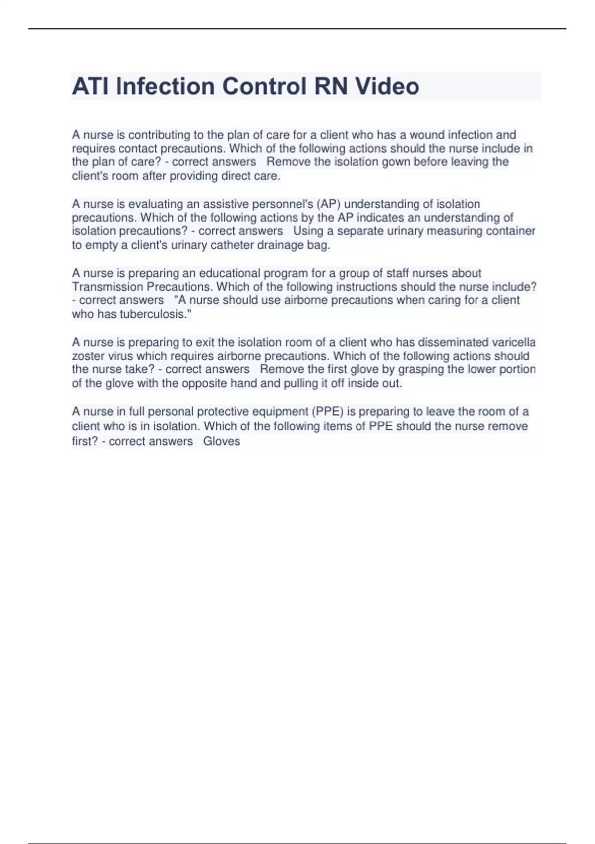 ATI Infection Control RN Video A nurse is contributing to the plan of care for a client who has a wound infection and requires contact precautions. Which of the following actions should the nurse include in the plan of care? - correct answers Remove the isolation gown before leaving the client's room after providing direct care. A nurse is evaluating an assistive personnel's (AP) understanding of isolation precautions. Which of the following actions by the AP indicates an understanding of isolation precautions? - correct answers Using a separate urinary measuring container to empty a client's urinary catheter drainage bag. A nurse is preparing an educational program for a group of staff nurses about Transmission Precautions. Which of the following instructions should the nurse include? - correct answers "A nurse should use airborne precautions when caring for a client who has tuberculosis." A nurse is preparing to exit the isolation room of a client who has disseminated varicella zoster virus which requires airborne precautions. Which of the following actions should the nurse take? - correct answers Remove the first glove by grasping the lower portion of the glove with the opposite hand and pulling it off inside out. A nurse in full personal protective equipment (PPE) is preparing to leave the room of a client who is in isolation. Which of the following items of PPE should the nurse remove first? - correct answers Glove
