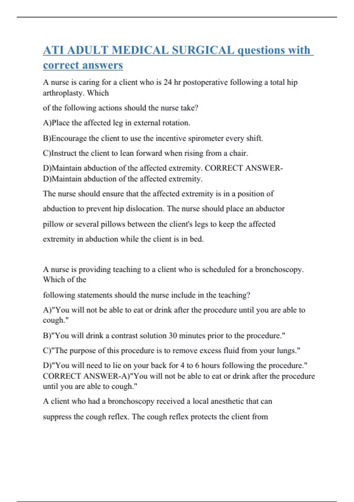 A nurse is caring for a client who is 24 hr postoperative following a total hip arthroplasty. Which of the following actions should the nurse take? A)Place the affected leg in external rotation. B)Encourage the client to use the incentive spirometer every shift. C)Instruct the client to lean forward when rising from a chair. D)Maintain abduction of the affected extremity. CORRECT ANSWER-D)Maintain abduction of the affected extremity. The nurse should ensure that the affected extremity is in a position of abduction to prevent hip dislocation. The nurse should place an abductor pillow or several pillows between the client's legs to keep the affected extremity in abduction while the client is in bed. A nurse is providing teaching to a client who is scheduled for a bronchoscopy. Which of the following statements should the nurse include in the teaching? A)"You will not be able to eat or drink after the procedure until you are able to cough." B)"You will drink a contrast solution 30 minutes prior to the procedure." C)"The purpose of this procedure is to remove excess fluid from your lungs." D)"You will need to lie on your back for 4 to 6 hours following the procedure." CORRECT ANSWER-A)"You will not be able to eat or drink after the procedure until you are able to cough." A client who had a bronchoscopy received a local anesthetic that can suppress the cough reflex