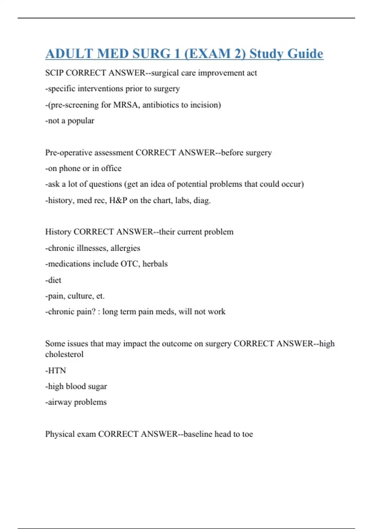 SCIP CORRECT ANSWER--surgical care improvement act -specific interventions prior to surgery -(pre-screening for MRSA, antibiotics to incision) -not a popular Pre-operative assessment CORRECT ANSWER--before surgery -on phone or in office -ask a lot of questions (get an idea of potential problems that could occur) -history, med rec, H&P on the chart, labs, diag. History CORRECT ANSWER--their current problem -chronic illnesses, allergies -medications include OTC, herbals -diet -pain, culture, et. -chronic pain? : long term pain meds, will not work Some issues that may impact the outcome on surgery CORRECT ANSWER--high cholesterol -HTN -high blood sugar -airway problems Physical exam CORRECT ANSWER--base