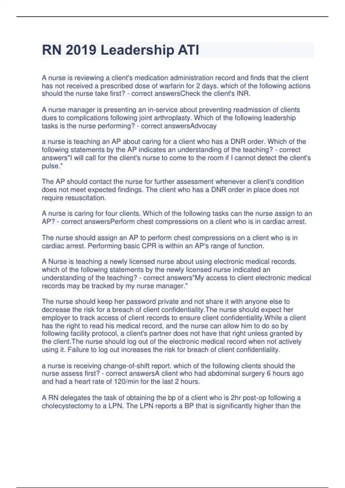RN 2019 Leadership ATI A nurse is reviewing a client's medication administration record and finds that the client has not received a prescribed dose of warfarin for 2 days. which of the following actions should the nurse take first? - correct answersCheck the client's INR. A nurse manager is presenting an in-service about preventing readmission of clients dues to complications following joint arthroplasty. Which of the following leadership tasks is the nurse performing? - correct answersAdvocay a nurse is teaching an AP about caring for a client who has a DNR order. Which of the following statements by the AP indicates an understanding of the teaching? - correct answers"I will call for the client's nurse to come to the room if I cannot detect the client's pulse." The AP should contact the nurse for further assessment whenever a client's condition does not meet expected findings. The client who has a DNR order in place does not require resuscitation. A nurse is caring for four clients. Which of the following tasks can the nurse assign to an AP? - correct answersPerform chest compressions on a client who is in cardiac arrest. The nurse should assign an AP to perform chest compressions on a client who is in cardiac arrest. Performing basic CPR is within an AP's range of function. A Nurse is teaching a newly licensed nurse about using electronic medical records. which of the following statements by the newly licensed nurse indicated an understanding of the teaching? - correct answers"My access to client electronic medical records may be tracked by my nurse manager." The nurse should keep her password private and not share it with anyone else to decrease the risk for a breach of client confidentiality.The nurse should expect her employer to track access of client records to ensure client confidentiality.While a client has the right to read his medical record, and the nurse can allow him to do so by following facility protocol, a client's partner does not have that right unless granted by the client.The nurse should log out of the electronic medical record when not actively using it. Failure to log out increases the risk for breach of client confidentiality. a nurse is receiving change-of-shift report. which of the following clients should the nurse assess first? - correct answersA client who had abdominal surgery 6 hours ago and had a heart rate of 120/min for the last 2 hours. A RN delegates the task of obtaining the bp of a client who is 2hr post-op following a cholecystectomy to a LPN. The LPN reports a BP that is significantly higher than the clients previous reading. which of the following actions should the RN take first? - correct answersRecheck client's BP A public health nurse is developing a list of recommendations for her supervisior on how to use EBP to improve community outcomes. Which of the following should the nurse recommend as a qualitative research method? - correct answersPhenomenology Meta-analysis is a quantitative research method that provides a statistical analysis of multiple studies conducted on the same topic.Experimental study is a quantitative research method that uses control and treatment groups to test at least one independent variable.Phenomenology is a qualitative research method that provides additional understanding of participants' experiences with emotional variances, such as grief and hope.Secondary analysis is a quantitative research method that uses previously collected data to answer newly formed hypotheses. A nurse at a urgent care clinic notices that a pain assessment is not being performed for all clients as required by policy. Which of the following actions should the nurse take to ensure care is provided according to policy? - correct answersReport this issue to the nurse manager. The nurse should report this issue to the nurse manager because it is the manager's responsibility to ensure that standards are met and that care is provided according to policy. A nurse is teaching a client about advance directives. Which of the following statements by the client indicates an understanding of the teaching? - correct answers"These will outline my wishes for medication treatment." The purpose of advance directives is to outline the client's wishes if they become unresponsive A nurse is caring for a client who recently learned he has a mutation of the BRCA2 gene. The client states that he does not plan to tell his adult children about the dx. Which of the following responses displays clients advocacy by the nurse? - correct answers"Let's review what you understand about this test result." The nurse should use therapeutic communication techniques to encourage the client to share his point of view and to convey respect for the client's decisions. By seeking to understand the client's perceptions in a nonjudgmental manner, the nurse is displaying client advocacy. A nurse is caring for a client who has breast cancer and is deciding on a plan of treatment. which of the following statements should the nurse make? - correct answers"Let's talk about the benefits of each treatment."