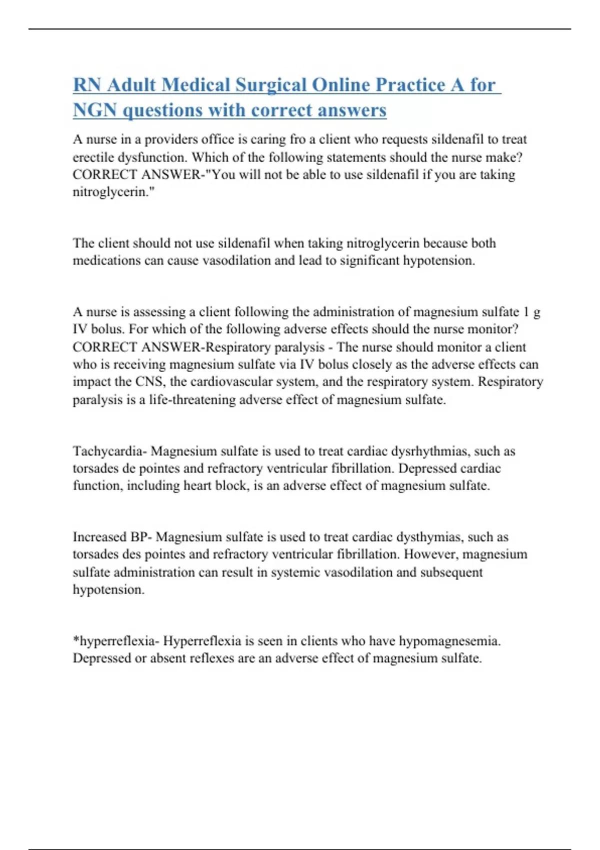 A nurse in a providers office is caring fro a client who requests sildenafil to treat erectile dysfunction. Which of the following statements should the nurse make? CORRECT ANSWER-"You will not be able to use sildenafil if you are taking nitroglycerin." The client should not use sildenafil when taking nitroglycerin because both medications can cause vasodilation and lead to significant hypotension. A nurse is assessing a client following the administration of magnesium sulfate 1 g IV bolus. For which of the following adverse effects should the nurse monitor? CORRECT ANSWER-Respiratory paralysis - The nurse should monitor a client who is receiving magnesium sulfate via IV bolus closely as the adverse effects can impact the CNS, the cardiovascular system, and the respiratory system. Respiratory paralysis is a life-threatening adverse effect of magnesium sulfate. Tachycardia- Magnesium sulfate is used to treat cardiac dysrhythmias, such as torsades de pointes and refractory ventricular fibrillation. Depressed cardiac function, including heart block, is an adverse effect of magnesium sulfate. Increased BP- Magnesium sulfate is used to treat cardiac dysthymias, such as torsades des pointes and refractory ventricular fibrillation. However, magnesium sulfate administration can result in systemic vasodilation and subsequent hypotension. *hyperreflexia- Hyperreflexia is seen in clients who have hypomagnesemia. Depressed or absent reflexes are an adverse effect o