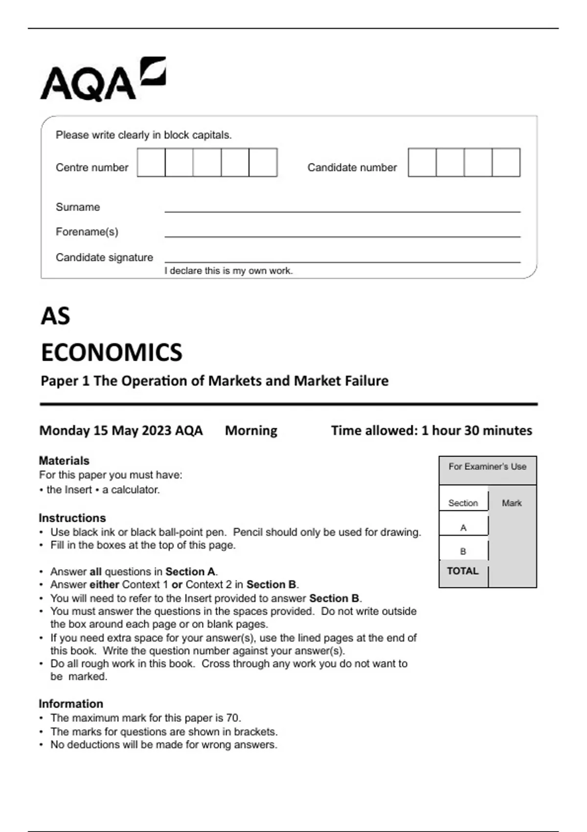 AQA AS ECONOMICS Paper 1 The Operation of Markets and Market Failure 7135-1-QP-Economics-AS-15May233